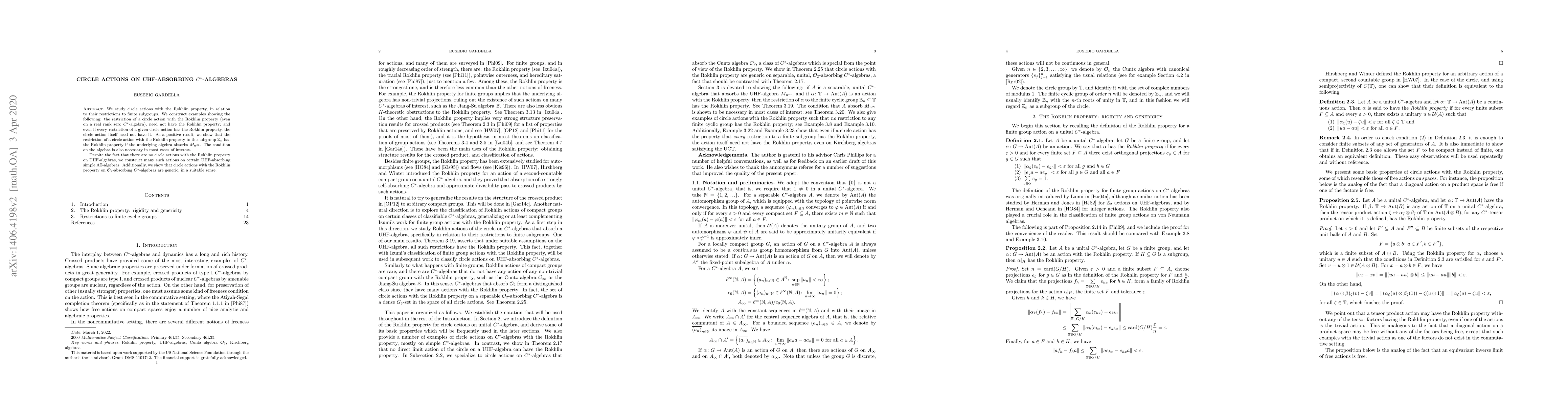 We study circle actions with the Rokhlin property, in relation to their restrictions to finite subgroups. We construct examples showing the following: the restriction of a circle action with the Rokhlin property (even on a real rank zero $C^*$-algebra), need not have the Rokhlin property; and even if every restriction of a given circle action has the Rokhlin property, the circle action itself need not have it. As a positive result, we show that the restriction of a circle action with the Rokhlin property to the subgroup $\mathbb{Z}_n$ has the Rokhlin property if the underlying algebra absorbs $M_{n^\infty}$. The condition on the algebra is also necessary in most cases of interest. Despite the fact that there are no circle actions with the Rokhlin property on UHF-algebras, we construct many such actions on certain UHF-absorbing simple AT-algebras. Additionally, we show that circle actions with the Rokhlin property on $\mathcal{O}_2$-absorbing $C^*$-algebras are generic, in a suitable sense.