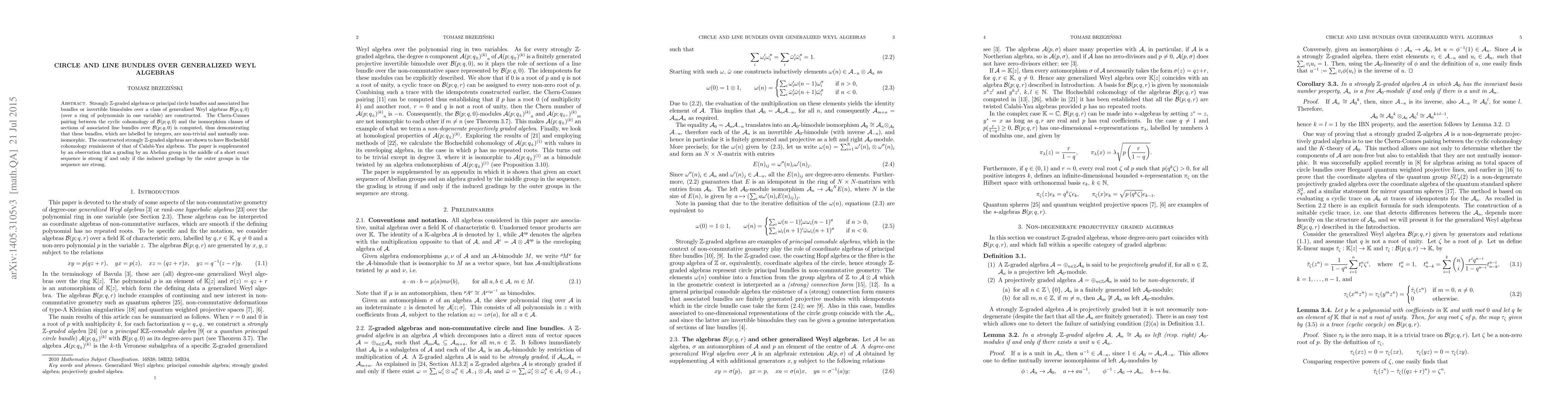 This paper constructs circle and line bundles over generalized Weyl algebras $\mathcal{B}(p;q, 0)$ and computes the Chern-Connes pairing, showing these bundles are non-trivial and non-isomorphic. It also reveals the Hochschild cohomology of these algebras resembles that of Calabi-Yau algebras.