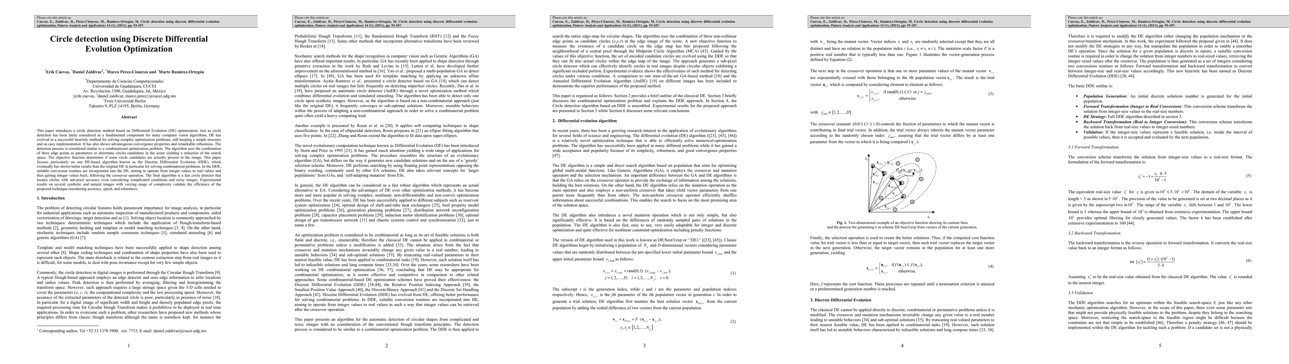This paper introduces a circle detection method based on Differential Evolution (DE) optimization. Just as circle detection has been lately considered as a fundamental component for many computer vision algorithms, DE has evolved as a successful heuristic method for solving complex optimization problems, still keeping a simple structure and an easy implementation. It has also shown advantageous convergence properties and remarkable robustness. The detection process is considered similar to a combinational optimization problem. The algorithm uses the combination of three edge points as parameters to determine circles candidates in the scene yielding a reduction of the search space. The objective function determines if some circle candidates are actually present in the image. This paper focuses particularly on one DE-based algorithm known as the Discrete Differential Evolution (DDE), which eventually has shown better results than the original DE in particular for solving combinatorial problems. In the DDE, suitable conversion routines are incorporated into the DE, aiming to operate from integer values to real values and then getting integer values back, following the crossover operation. The final algorithm is a fast circle detector that locates circles with sub-pixel accuracy even considering complicated conditions and noisy images. Experimental results on several synthetic and natural images with varying range of complexity validate the efficiency of the proposed technique considering accuracy, speed, and robustness.