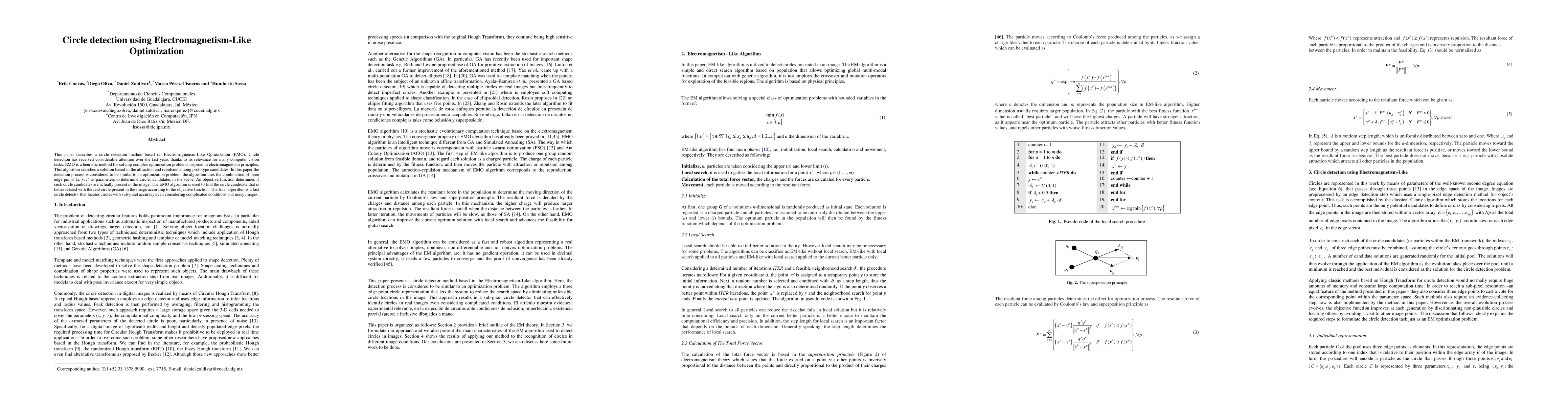 This paper describes a circle detection method based on Electromagnetism-Like Optimization (EMO). Circle detection has received considerable attention over the last years thanks to its relevance for many computer vision tasks. EMO is a heuristic method for solving complex optimization problems inspired in electromagnetism principles. This algorithm searches a solution based in the attraction and repulsion among prototype candidates. In this paper the detection process is considered to be similar to an optimization problem, the algorithm uses the combination of three edge points (x, y, r) as parameters to determine circles candidates in the scene. An objective function determines if such circle candidates are actually present in the image. The EMO algorithm is used to find the circle candidate that is better related with the real circle present in the image according to the objective function. The final algorithm is a fast circle detector that locates circles with sub-pixel accuracy even considering complicated conditions and noisy images.