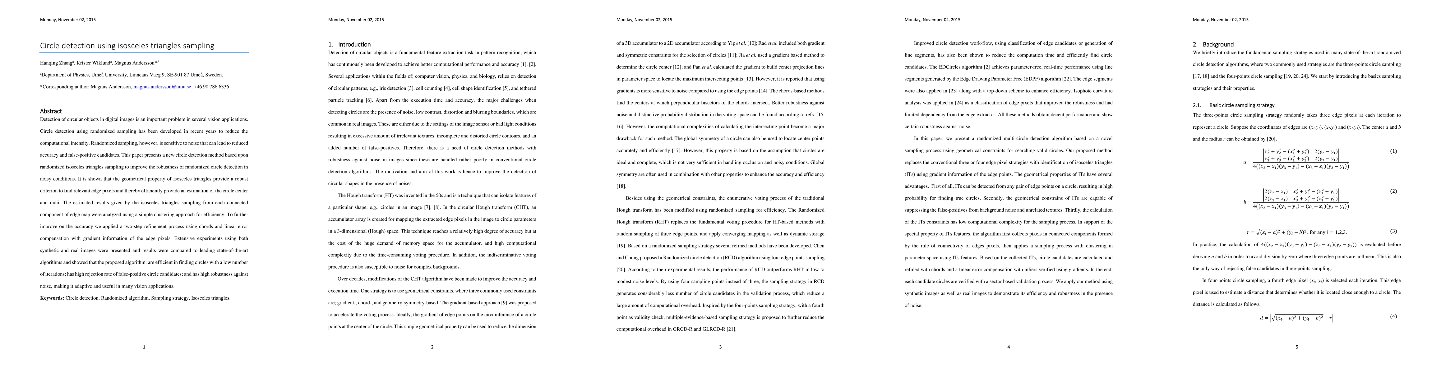 The paper presents a novel circle detection method using isosceles triangles (ITs) sampling, combined with clustering and a two-step refinement process for efficiency and accuracy.
