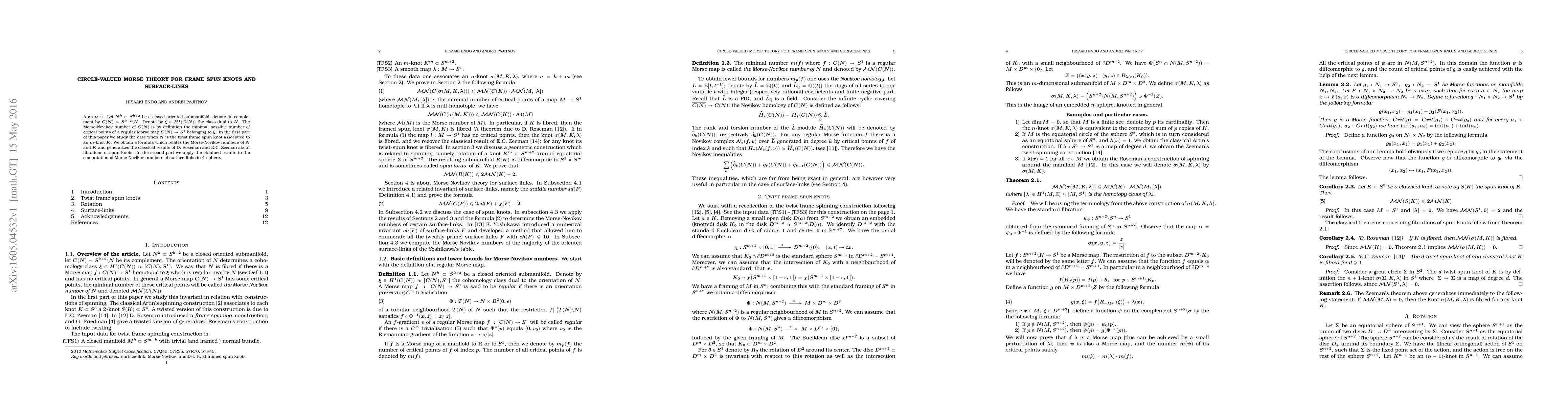 Let N be a closed oriented k-dimensional submanifold of the (k+2)-dimensional sphere; denote its complement by C(N). Denote by x the 1-dimensional cohomology class in C(N), dual to N. The Morse-Novikov number of C(N) is by definition the minimal possible number of critical points of a regular Morse map f from C(N) to a circle, such that f belongs to x. In the first part of this paper we study the case when N is the twist frame spun knot associated to an m-knot K. We obtain a formula which relates the Morse-Novikov numbers of N and K and generalizes the classical results of D. Roseman and E.C. Zeeman about fibrations of spun knots. In the second part we apply the obtained results to the computation of Morse-Novikov numbers of surface-links in 4-sphere.