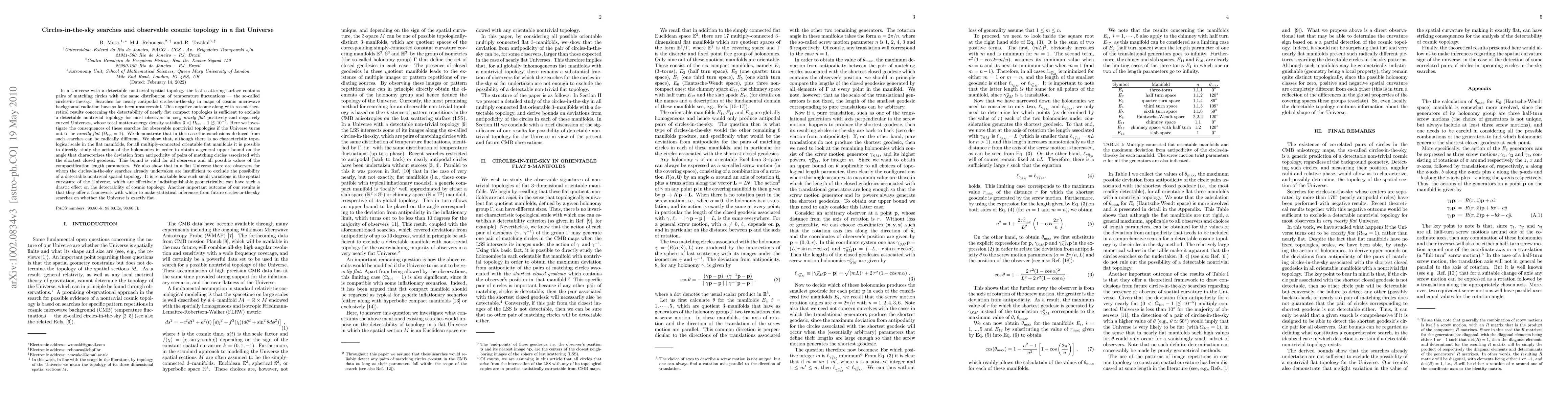 [Abridged] In a Universe with a detectable nontrivial spatial topology the last scattering surface contains pairs of matching circles with the same distribution of temperature fluctuations - the so-called circles-in-the-sky. Searches for nearly antipodal circles in maps of cosmic microwave background have so far been unsuccessful. This negative outcome along with recent theoretical results concerning the detectability of nearly flat compact topologies is sufficient to exclude a detectable nontrivial topology for most observers in very nearly flat positively and negatively curved Universes ($0<|\Omega_{tot}-1| \lesssim 10^{-5}$). Here we investigate the consequences of these searches for observable nontrivial topologies if the Universe turns out to be exactly flat ($\Omega_{tot}=1$). We demonstrate that in this case the conclusions deduced from such searches can be radically different. We show that for all multiply-connected orientable flat manifolds it is possible to directly study the action of the holonomies in order to obtain a general upper bound on the angle that characterizes the deviation from antipodicity of pairs of matching circles associated with the shortest closed geodesic. This bound is valid for all observers and all possible values of the compactification length parameters. We also show that in a flat Universe there are observers for whom the circles-in-the-sky searches already undertaken are insufficient to exclude the possibility of a detectable nontrivial spatial topology. It is remarkable how such small variations in the spatial curvature of the Universe, which are effectively indistinguishable geometrically, can have such a drastic effect on the detectability of cosmic topology.