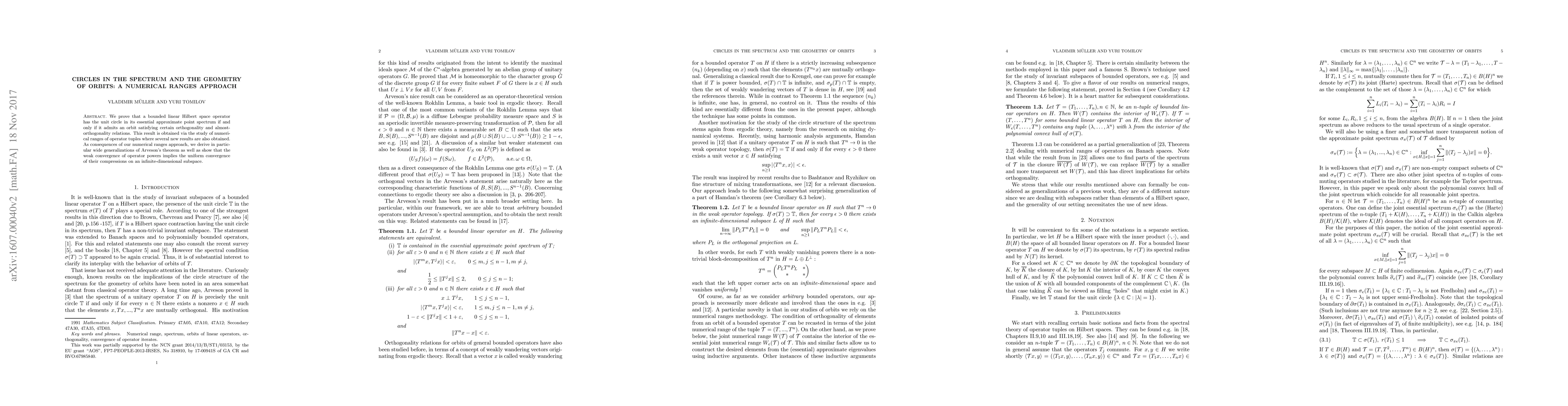 This paper establishes a connection between the unit circle in the essential approximate point spectrum of a bounded linear Hilbert space operator and the existence of specific orbits with orthogonality and almost-orthogonality relations. The study leverages the numerical ranges of operator tuples to derive generalizations of Arveson's theorem and show that weak convergence of operator powers implies uniform convergence of their compressions on an infinite-dimensional subspace.