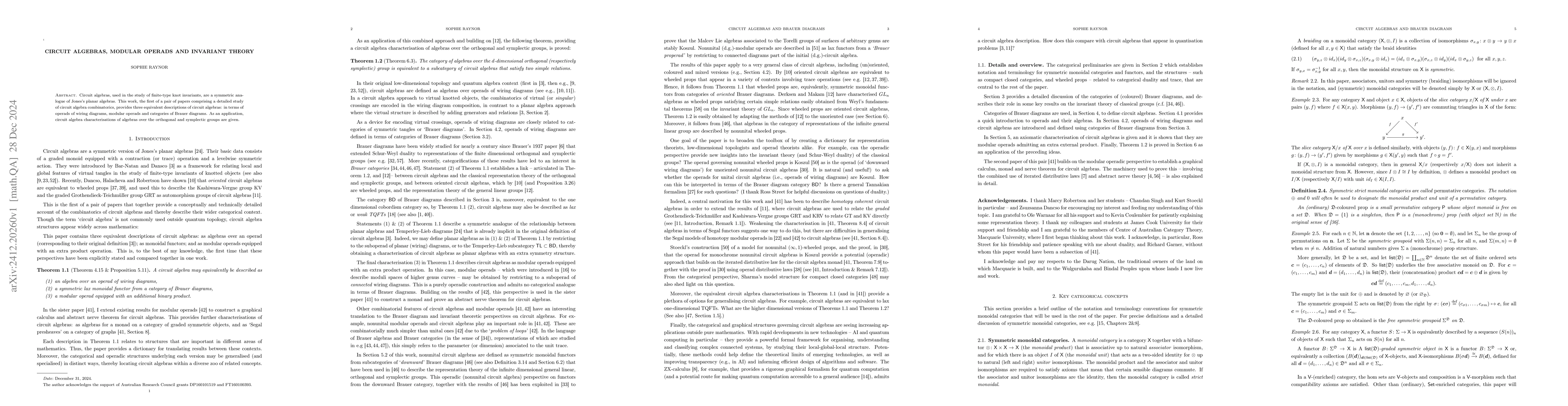 Circuit algebras, used in the study of finite-type knot invariants, are a symmetric analogue of Jones's planar algebras. This work, the first of a pair of papers comprising a detailed study of circuit algebra combinatorics, provides three equivalent descriptions of circuit algebras: in terms of operads of wiring diagrams, modular operads and categories of Brauer diagrams. As an application, circuit algebra characterisations of algebras over the orthogonal and symplectic groups are given.