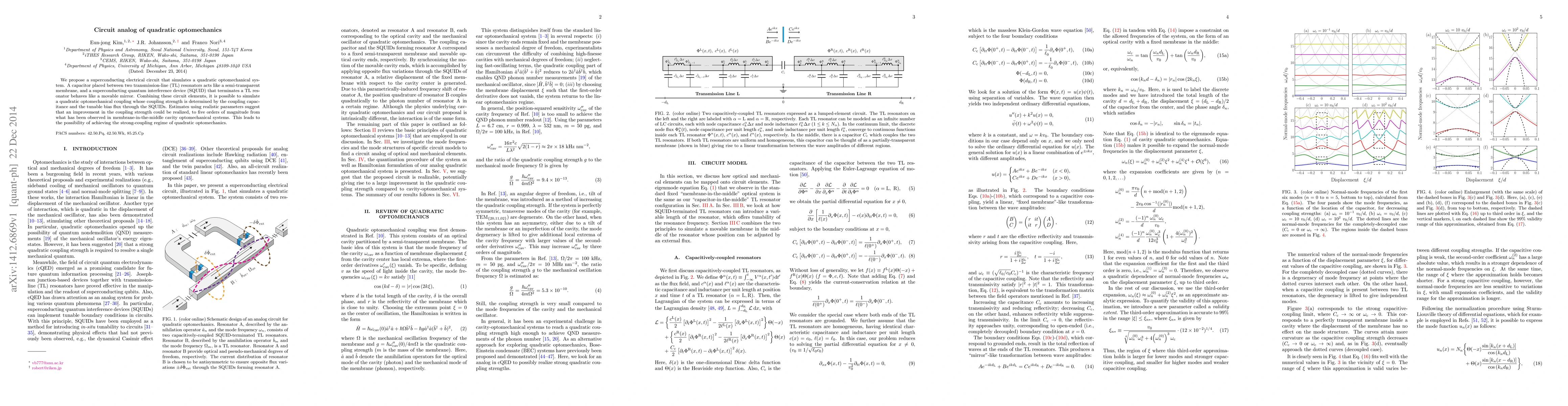 This paper proposes a superconducting electrical circuit that mimics a quadratic optomechanical system, using capacitors and SQUIDs to simulate a semi-transparent membrane and movable mirror, respectively. The circuit could achieve a significantly higher coupling strength, potentially reaching the strong-coupling regime.