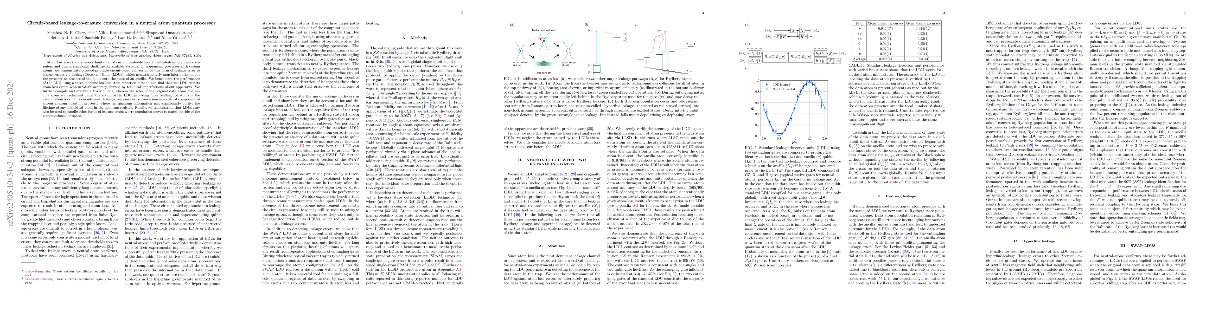 The paper presents a method to convert leakage errors into erasure errors in neutral atom quantum computers using "Leakage Detection Units" (LDUs), which non-destructively map qubit presence information onto an ancilla state, achieving ~93.4% accuracy. The authors also propose a SWAP LDU for "free refilling" of atoms in case of leakage, which is essential for quantum information longevity beyond individual atom lifetimes.