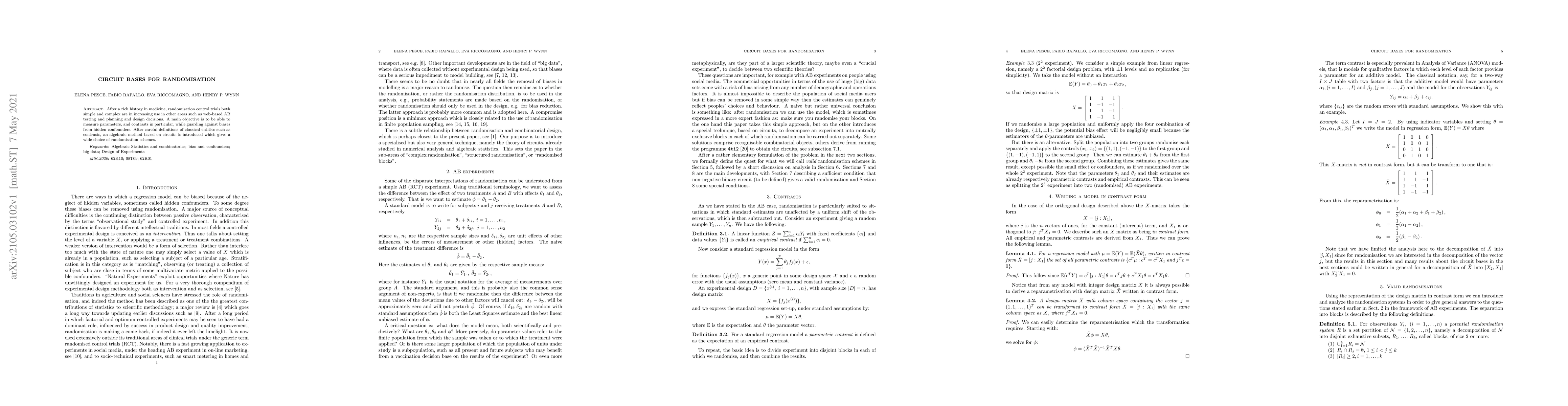 After a rich history in medicine, randomisation control trials both simple and complex are in increasing use in other areas such as web-based AB testing and planning and design decisions. A main objective is to be able to measure parameters, and contrasts in particular, while guarding against biases from hidden confounders. After careful definitions of classical entities such as contrasts, an algebraic method based on circuits is introduced which gives a wide choice of randomisation schemes.