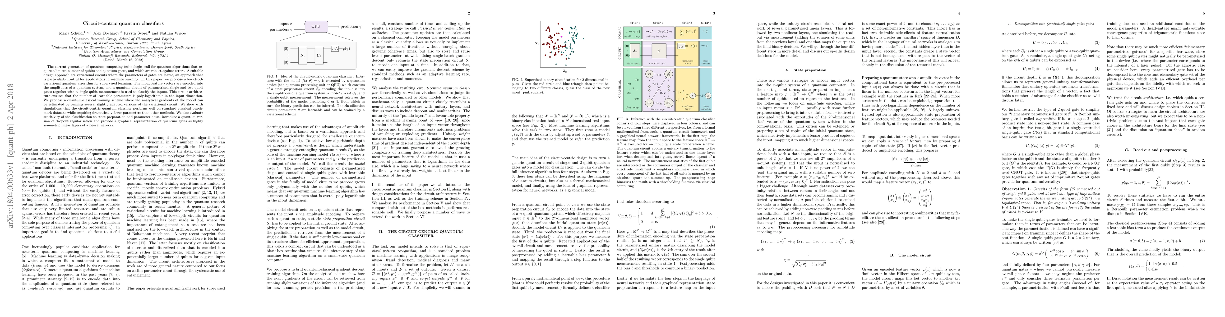 The current generation of quantum computing technologies call for quantum algorithms that require a limited number of qubits and quantum gates, and which are robust against errors. A suitable design approach are variational circuits where the parameters of gates are learnt, an approach that is particularly fruitful for applications in machine learning. In this paper, we propose a low-depth variational quantum algorithm for supervised learning. The input feature vectors are encoded into the amplitudes of a quantum system, and a quantum circuit of parametrised single and two-qubit gates together with a single-qubit measurement is used to classify the inputs. This circuit architecture ensures that the number of learnable parameters is poly-logarithmic in the input dimension. We propose a quantum-classical training scheme where the analytical gradients of the model can be estimated by running several slightly adapted versions of the variational circuit. We show with simulations that the circuit-centric quantum classifier performs well on standard classical benchmark datasets while requiring dramatically fewer parameters than other methods. We also evaluate sensitivity of the classification to state preparation and parameter noise, introduce a quantum version of dropout regularisation and provide a graphical representation of quantum gates as highly symmetric linear layers of a neural network.