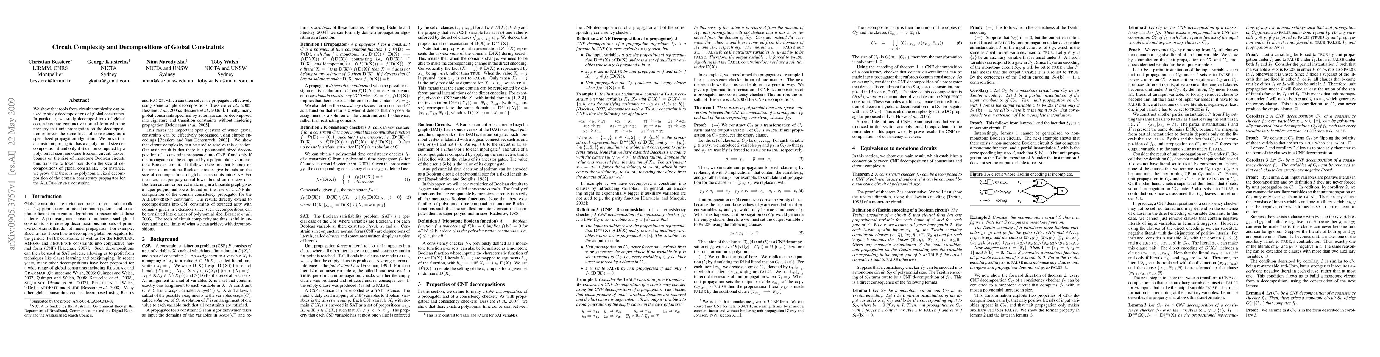 This paper demonstrates how circuit complexity techniques can analyze decompositions of global constraints, showing that a constraint propagator can be decomposed into a polynomial size conjunctive normal form if it can be computed by a polynomial size monotone Boolean circuit. It also establishes that lower bounds on monotone Boolean circuits imply lower bounds on the size of such decompositions, proving the non-existence of polynomial sized decompositions for the ALLDIFFERENT constraint.
