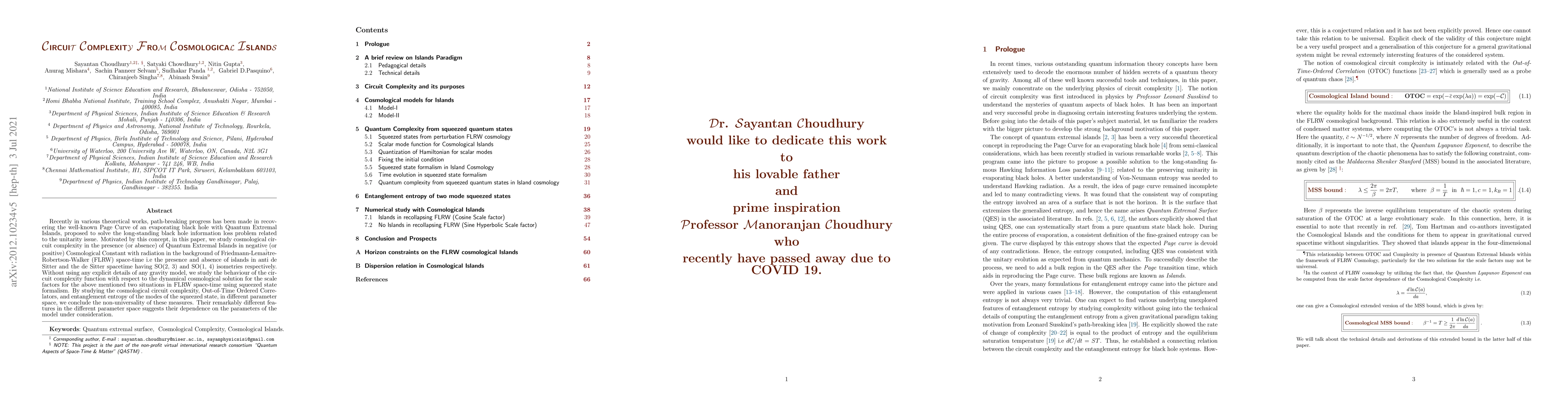 Recently in various theoretical works, path-breaking progress has been made in recovering the well-known Page Curve of an evaporating black hole with Quantum Extremal Islands, proposed to solve the long-standing black hole information loss problem related to the unitarity issue. Motivated by this concept, in this paper, we study cosmological circuit complexity in the presence (or absence) of Quantum Extremal Islands in the negative (or positive) Cosmological Constant with radiation in the background of Friedmann-Lema$\hat{i}$tre-Robertson-Walker (FLRW) space-time i.e the presence and absence of islands in anti-de Sitter and the de Sitter spacetime having SO(2, 3) and SO(1, 4) isometries respectively. Without using any explicit details of any gravity model, we study the behaviour of the circuit complexity function with respect to the dynamical cosmological solution for the scale factors for the above-mentioned two situations in FLRW space-time using squeezed state formalism. By studying the cosmological circuit complexity, Out-of-Time Ordered Correlators, and entanglement entropy of the modes of the squeezed state, in different parameter spaces, we conclude the non-universality of these measures. Their remarkably different features in the different parameter spaces suggest their dependence on the parameters of the model under consideration.