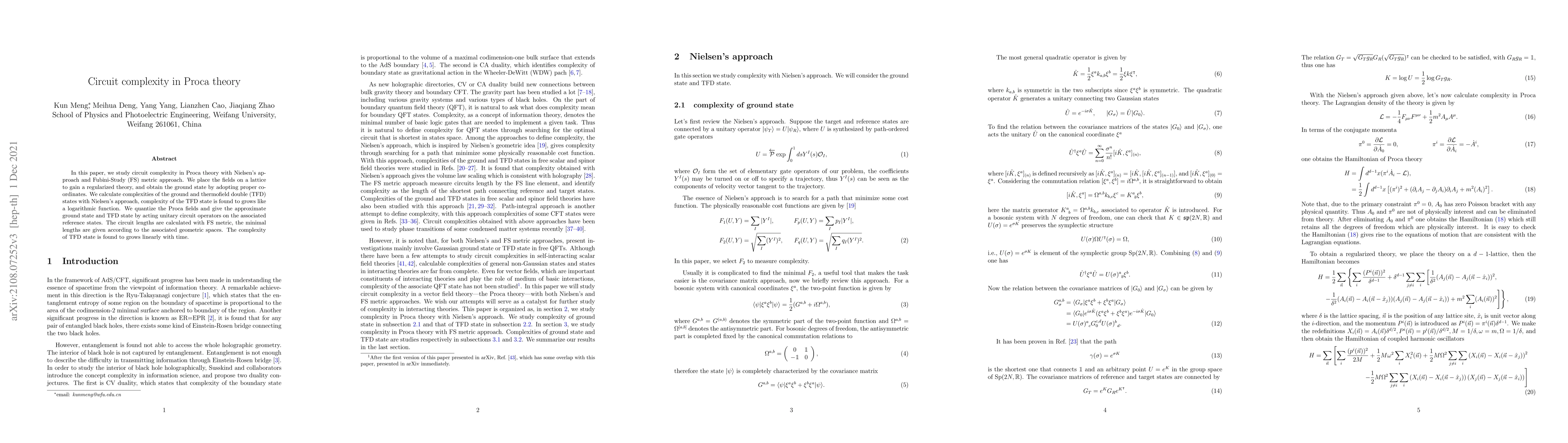 In this paper, we study circuit complexity in Proca theory with Nielsen's approach and Fubini-Study (FS) metric approach. We place the fields on a lattice to gain a regularized theory, and obtain the ground state by adopting proper coordinates. We calculate complexities of the ground and thermofield double (TFD) states with Nielsen's approach, complexity of the TFD state is found to grows like a logarithmic function. We quantize the Proca fields and give the approximate ground state and TFD state by acting unitary circuit operators on the associated reference states. The circuit lengths are calculated with FS metric, the minimal lengths are given according to the associated geometric spaces. The complexity of TFD state is found to grows linearly with time.