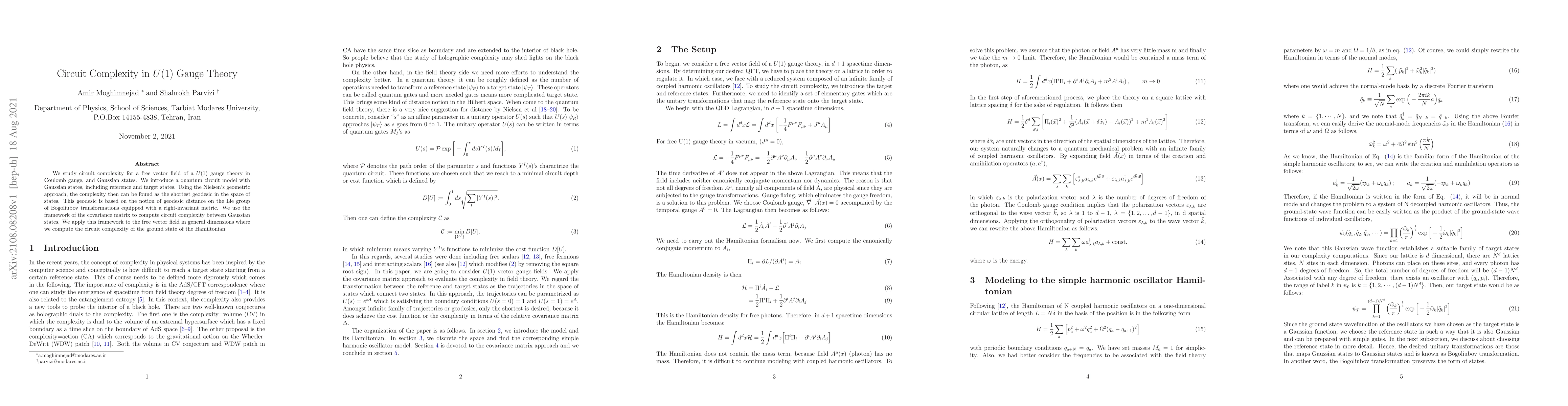 This paper investigates circuit complexity in a free vector field of $U(1)$ gauge theory in Coulomb gauge using Gaussian states. It employs Nielsen's geometric approach to determine the shortest geodesic in the space of states, based on the Lie group of Bogoliubov transformations, and computes this complexity using the covariance matrix framework.