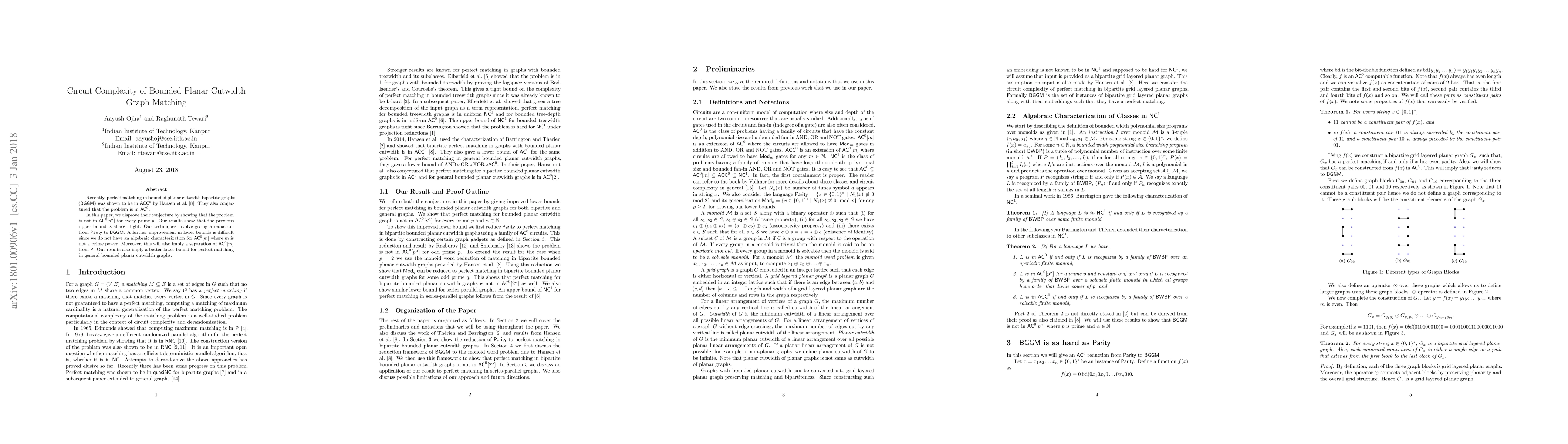This paper disproves the conjecture that perfect matching in bounded planar cutwidth bipartite graphs is in AC$^0$, showing instead it is not in AC$^0[p^{\alpha}]$ for any prime $p$. The authors achieve this by reducing Parity to the problem, indicating the previous upper bound is nearly tight.