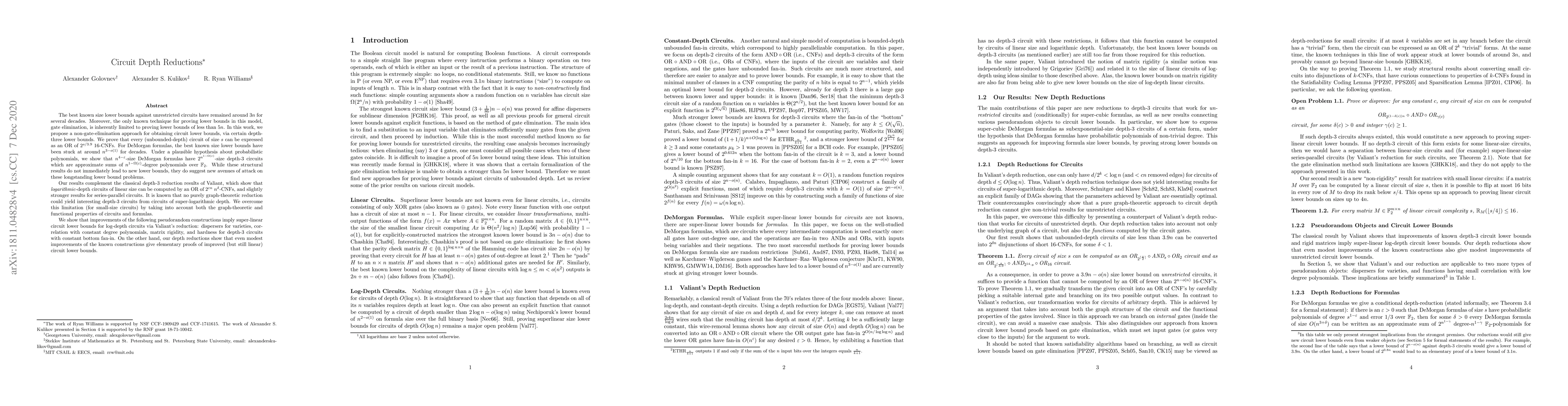 The best known size lower bounds against unrestricted circuits have remained around $3n$ for several decades. Moreover, the only known technique for proving lower bounds in this model, gate elimination, is inherently limited to proving lower bounds of less than $5n$. In this work, we propose a non-gate-elimination approach for obtaining circuit lower bounds, via certain depth-three lower bounds. We prove that every (unbounded-depth) circuit of size $s$ can be expressed as an OR of $2^{s/3.9}$ $16$-CNFs. For DeMorgan formulas, the best known size lower bounds have been stuck at around $n^{3-o(1)}$ for decades. Under a plausible hypothesis about probabilistic polynomials, we show that $n^{4-\varepsilon}$-size DeMorgan formulas have $2^{n^{1-\Omega(\varepsilon)}}$-size depth-3 circuits which are approximate sums of $n^{1-\Omega(\varepsilon)}$-degree polynomials over ${\mathbb F}_2$. While these structural results do not immediately lead to new lower bounds, they do suggest new avenues of attack on these longstanding lower bound problems. Our results complement the classical depth-$3$ reduction results of Valiant, which show that logarithmic-depth circuits of linear size can be computed by an OR of $2^{\varepsilon n}$ $n^{\delta}$-CNFs, and slightly stronger results for series-parallel circuits. It is known that no purely graph-theoretic reduction could yield interesting depth-3 circuits from circuits of super-logarithmic depth. We overcome this limitation (for small-size circuits) by taking into account both the graph-theoretic and functional properties of circuits and formulas. We show that improvements of the following pseudorandom constructions imply new circuit lower bounds: dispersers for varieties, correlation with constant degree polynomials, matrix rigidity, and hardness for depth-$3$ circuits with constant bottom fan-in.