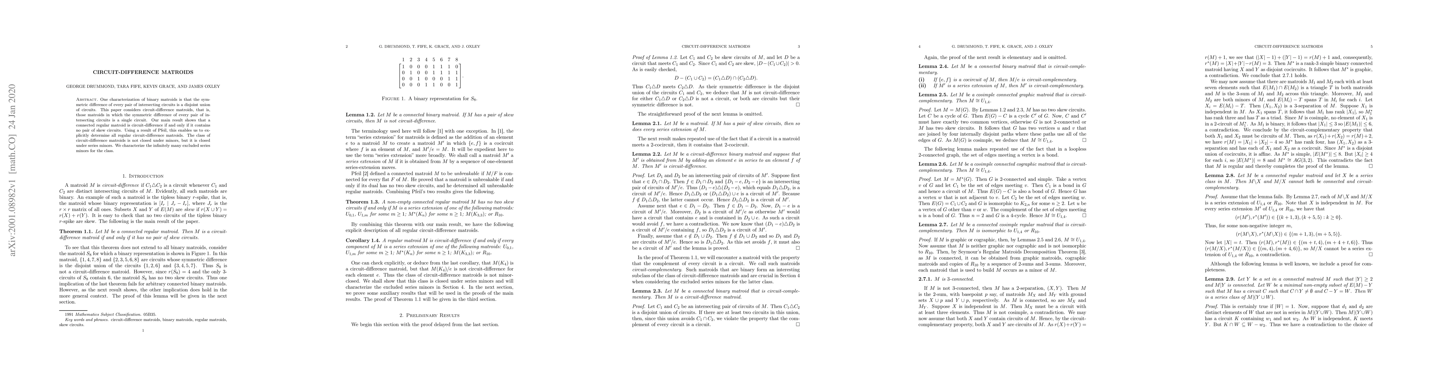 One characterization of binary matroids is that the symmetric difference of every pair of intersecting circuits is a disjoint union of circuits. This paper considers circuit-difference matroids, that is, those matroids in which the symmetric difference of every pair of intersecting circuits is a single circuit. Our main result shows that a connected regular matroid is circuit-difference if and only if it contains no pair of skew circuits. Using a result of Pfeil, this enables us to explicitly determine all regular circuit-difference matroids. The class of circuit-difference matroids is not closed under minors, but it is closed under series minors. We characterize the infinitely many excluded series minors for the class.