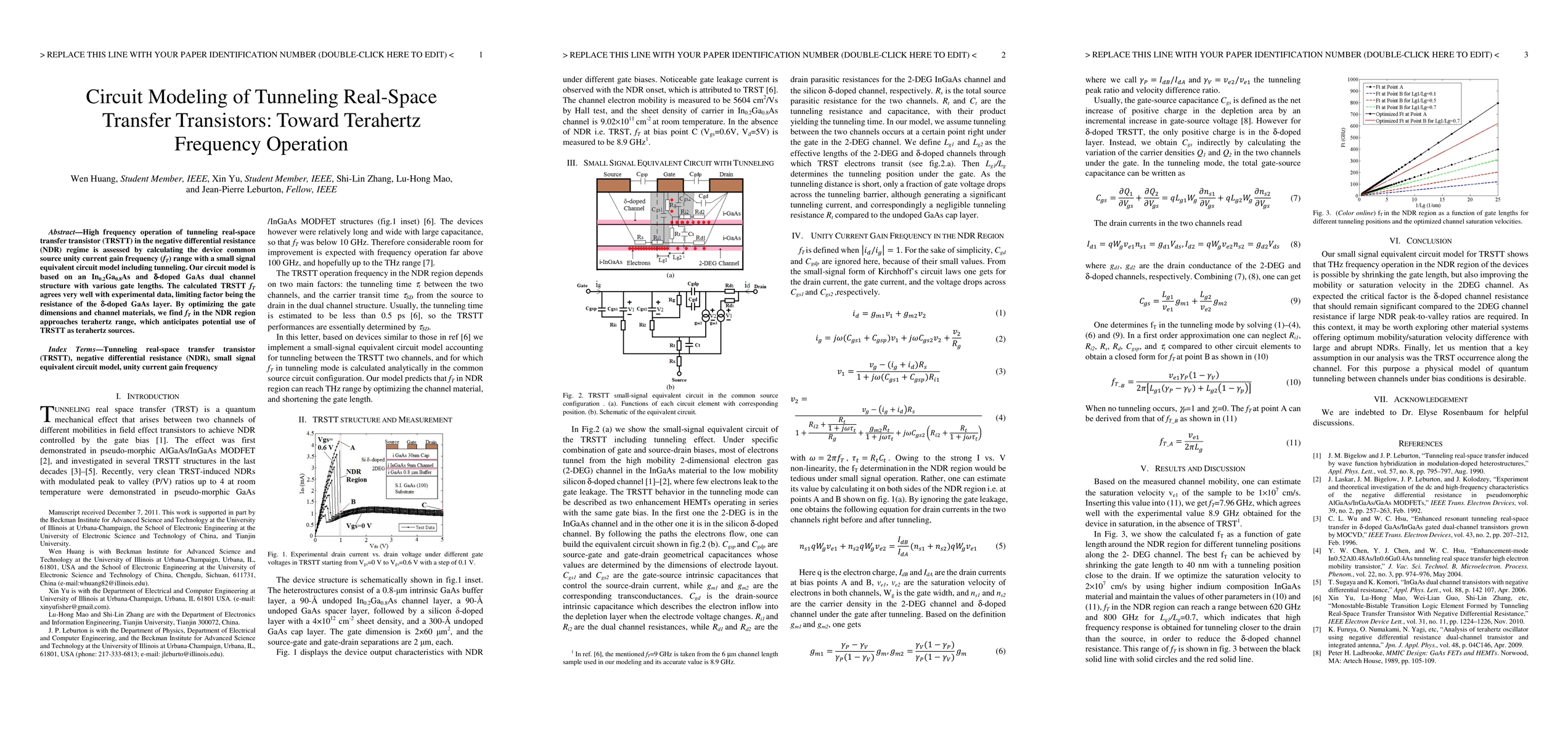 High frequency operation of tunneling real-space transfer transistor (TRSTT) in the negative differential resistance (NDR) regime is assessed by calculating the device common source unity current gain frequency (fT) range with a small signal equivalent circuit model including tunneling. Our circuit model is based on an In0.2Ga0.8As and delta-doped GaAs dual channel structure with various gate lengths. The calculated TRSTT fT agrees very well with experimental data, limiting factor being the resistance of the delta-doped GaAs layer. By optimizing the gate dimensions and channel materials, we find fT in the NDR region approaches terahertz range, which anticipates potential use of TRSTT as terahertz sources.