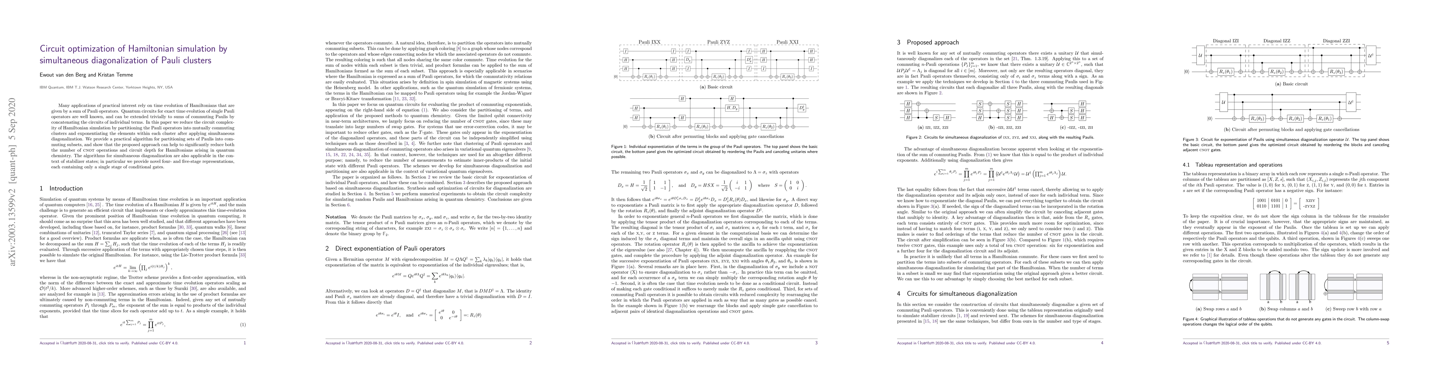 This paper proposes a method to optimize quantum circuits for Hamiltonian simulation by partitioning Pauli operators into commuting clusters, applying simultaneous diagonalization, and exponentiating within each cluster. The approach significantly reduces the number of CNOT operations and circuit depth, particularly for Hamiltonians in quantum chemistry, and introduces novel four- and five-stage representations for stabilizer states.