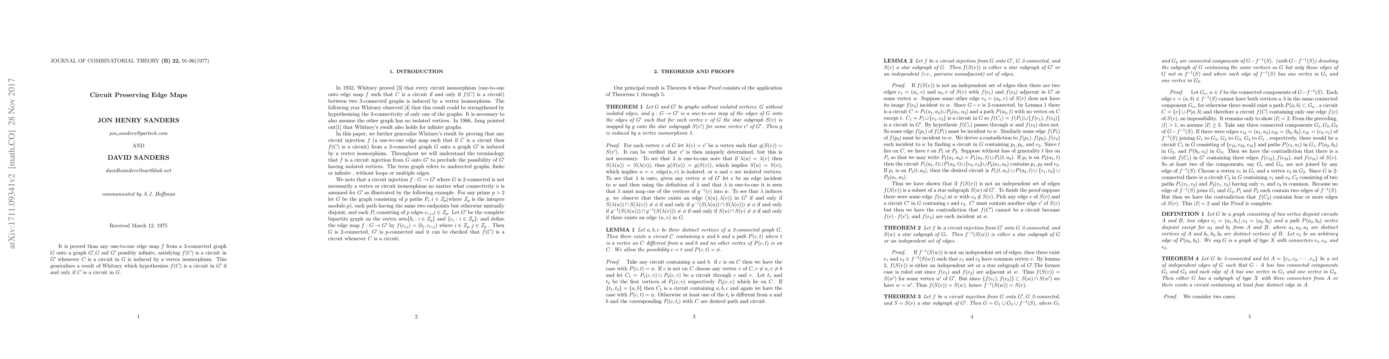 It is proved that any one-to-one edge map f from a 3-connected graph G onto a graph H, G and H possibly infinite, satisfying f(C) is a circuit in H whenever C is a circuit in G is induced by a vertex isomorphism. This generalizes a result of Whitney which hypothesizes f(C) is a circuit in H if and only if C is a circuit in G.