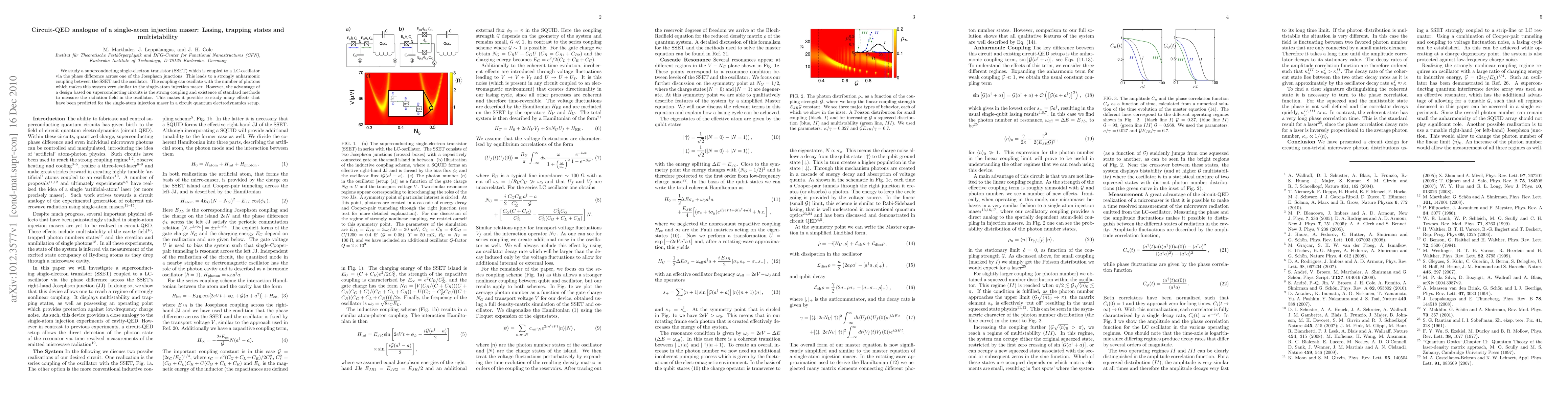 This paper investigates a superconducting single-electron transistor coupled to an LC-oscillator, demonstrating strong anharmonic coupling akin to a single-atom injection maser. The study highlights the potential for lasing, trapping states, and multistability in a circuit quantum electrodynamics setup, leveraging the advantages of superconducting circuits for precise measurement and analysis.