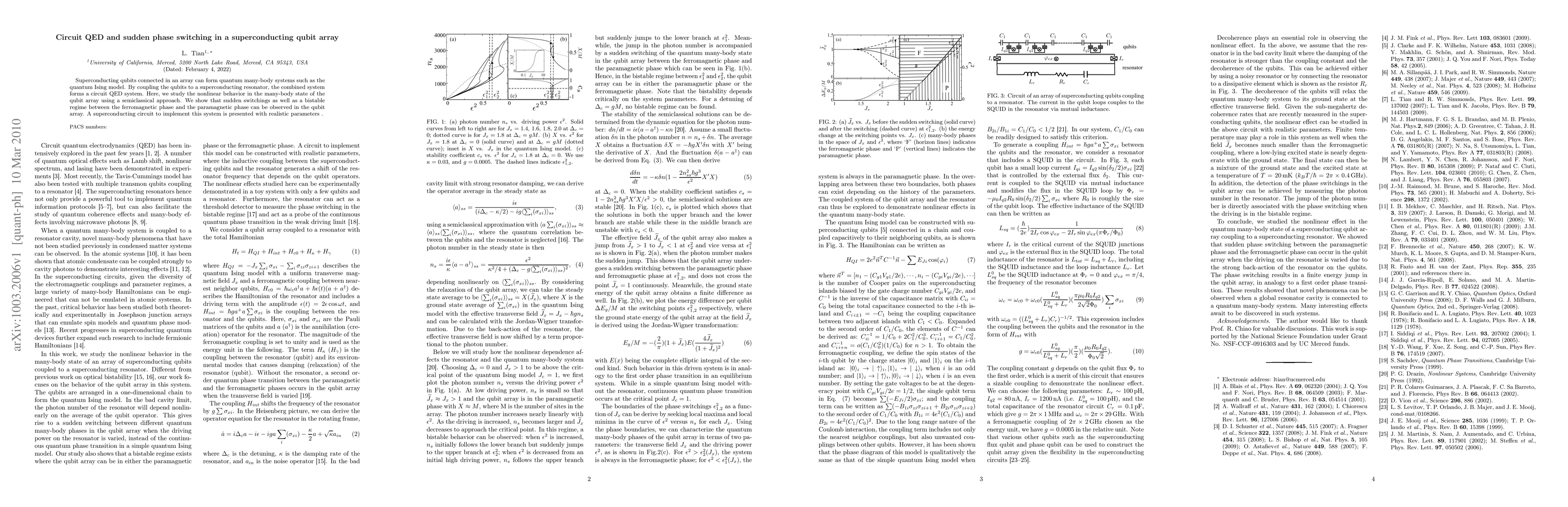 Superconducting qubits connected in an array can form quantum many-body systems such as the quantum Ising model. By coupling the qubits to a superconducting resonator, the combined system forms a circuit QED system. Here, we study the nonlinear behavior in the many-body state of the qubit array using a semiclassical approach. We show that sudden switchings as well as a bistable regime between the ferromagnetic phase and the paramagnetic phase can be observed in the qubit array. A superconducting circuit to implement this system is presented with realistic parameters .