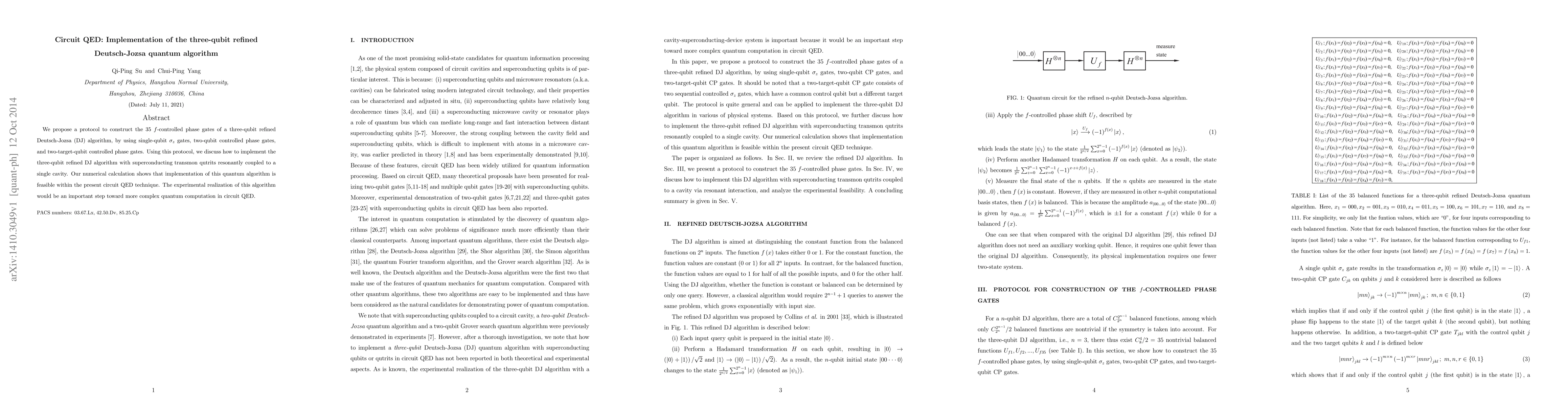 This paper proposes a protocol for implementing the three-qubit refined Deutsch-Jozsa algorithm using single-qubit and controlled phase gates in circuit QED. The feasibility of this implementation with superconducting transmon qutrits coupled to a cavity is demonstrated through numerical calculations, highlighting its potential for advancing quantum computation.
