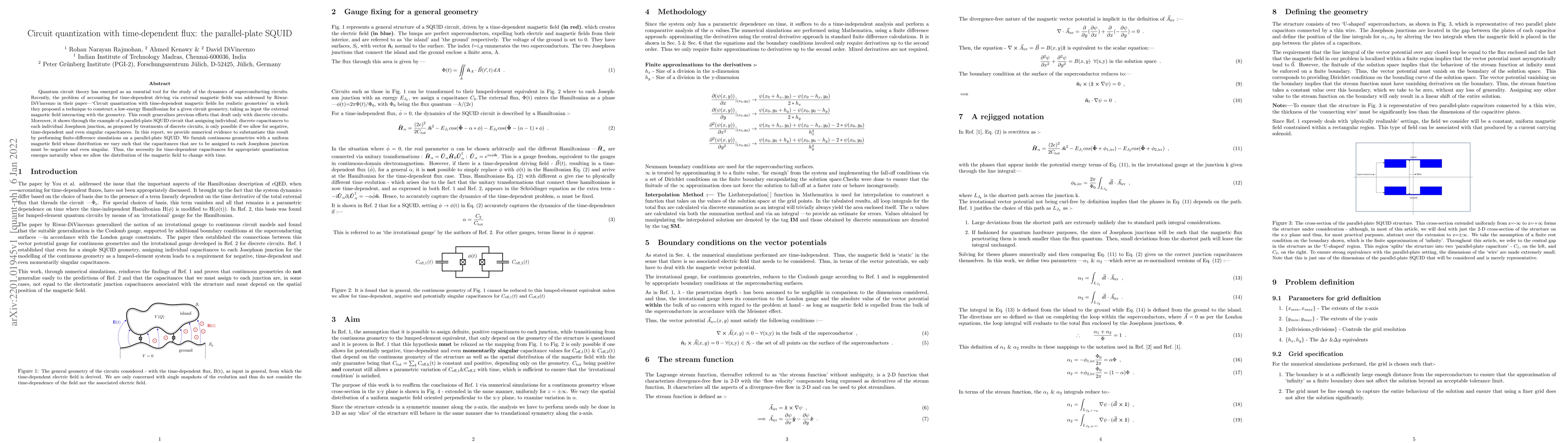 Quantum circuit theory has emerged as an essential tool for the study of the dynamics of superconducting circuits. Recently, the problem of accounting for time-dependent driving via external magnetic fields was addressed by Riwar-DiVincenzo in their paper - 'Circuit quantization with time-dependent magnetic fields for realistic geometries' in which they proposed a technique to construct a low-energy Hamiltonian for a given circuit geometry, taking as input the external magnetic field interacting with the geometry. This result generalises previous efforts that dealt only with discrete circuits. Moreover, it shows through the example of a parallel-plate SQUID circuit that assigning individual, discrete capacitances to each individual Josephson junction, as proposed by treatments of discrete circuits, is only possible if we allow for negative, time-dependent and even singular capacitances. In this report, we provide numerical evidence to substantiate this result by performing finite-difference simulations on a parallel-plate SQUID. We furnish continuous geometries with a uniform magnetic field whose distribution we vary such that the capacitances that are to be assigned to each Josephson junction must be negative and even singular. Thus, the necessity for time-dependent capacitances for appropriate quantization emerges naturally when we allow the distribution of the magnetic field to change with time.