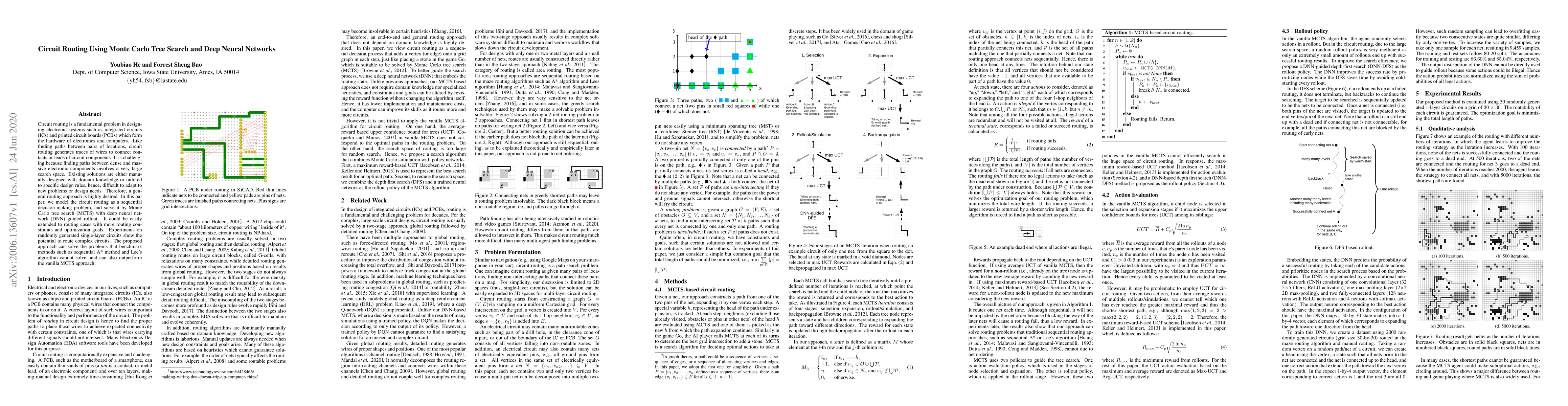 This paper proposes a novel circuit routing method using Monte Carlo tree search (MCTS) enhanced by deep neural networks (DNN) to tackle the large search space inherent in electronic circuit design. The approach outperforms existing methods and demonstrates potential for general applicability to various routing constraints and optimization goals.