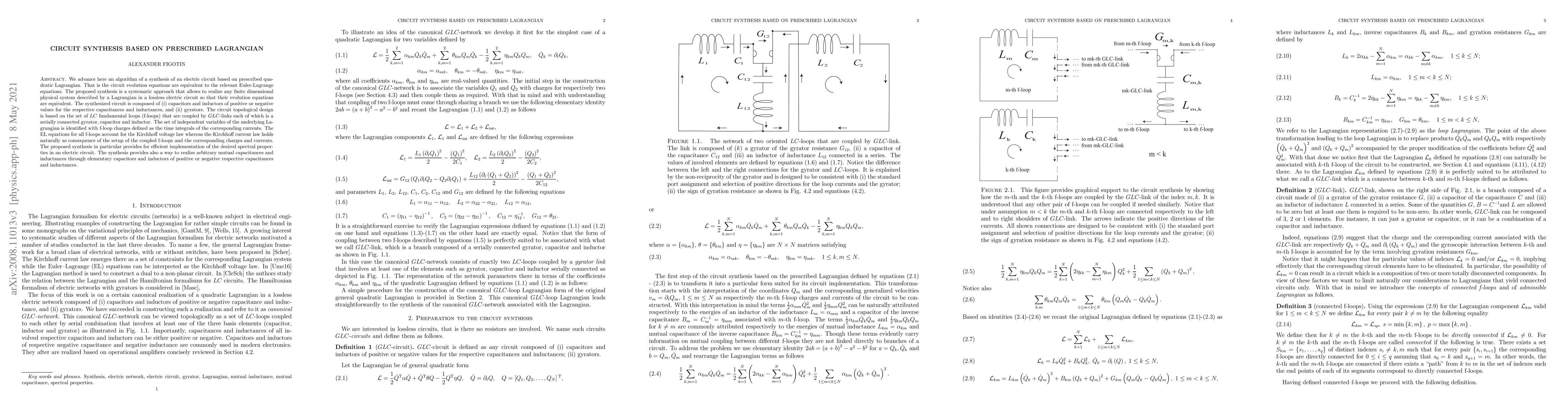 We advance here an algorithm of a synthesis of an electric circuit based on prescribed quadratic Lagrangian. That is the circuit evolution equations are equivalent to the relevant Euler-Lagrange equations. The proposed synthesis is a systematic approach that allows to realize any finite dimensional physical system described by a Lagrangian in a lossless electric circuit so that their evolution equations are equivalent. The synthesized circuit is composed of (i) capacitors and inductors of positive or negative values for the respective capacitances and inductances, and (ii) gyrators. The circuit topological design is based on the set of LC fundamental loops (f-loops) that are coupled by GLC-links each of which is a serially connected gyrator, capacitor and inductor. The set of independent variables of the underlying Lagrangian is identified with f-loop charges defined as the time integrals of the corresponding currents. The EL equations for all f-loops account for the Kirchhoff voltage law whereas the Kirchhoff current law holds naturally as consequence of the setup of the coupled f-loops and the corresponding charges and currents. The proposed synthesis in particular provides for efficient implementation of the desired spectral properties in an electric circuit. The synthesis provides also a way to realize arbitrary mutual capacitances and inductances through elementary capacitors and inductors of positive or negative respective capacitances and inductances.