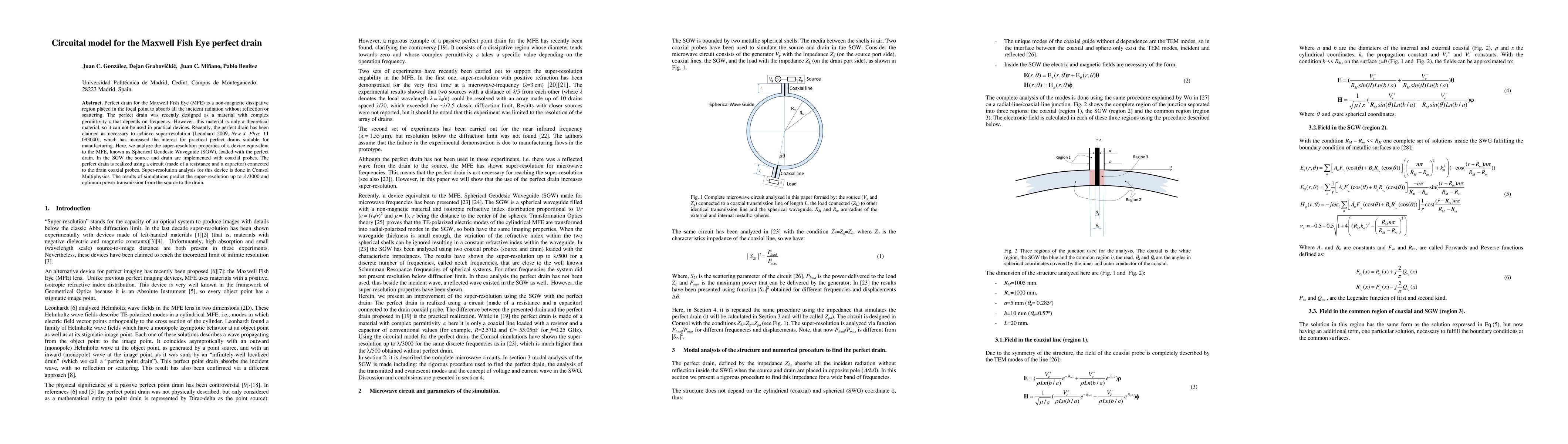 Perfect drain for the Maxwell Fish Eye (MFE) is a non-magnetic dissipative region placed in the focal point to absorb all the incident radiation without reflection or scattering. The perfect drain was recently designed as a material with complex electrical permittivity that depends on frequency. However, this material is only a theoretical material, so it can not be used in practical devices. Recently, the perfect drain has been claimed as necessary to achieve super-resolution [Leonhard 2009, New J. Phys. 11 093040], which has increased the interest for practical perfect drains suitable for manufacturing. Here, we analyze the super-resolution properties of a device equivalent to the MFE, known as Spherical Geodesic Waveguide (SGW), loaded with the perfect drain. In the SGW the source and drain are implemented with coaxial probes. The perfect drain is realized using a circuit (made of a resistance and a capacitor) connected to the drain coaxial probes. Super-resolution analysis for this device is done in Comsol Multiphysics. The results of simulations predict the super-resolution up to wavelength/3000 and optimum power transmission from the source to the drain.