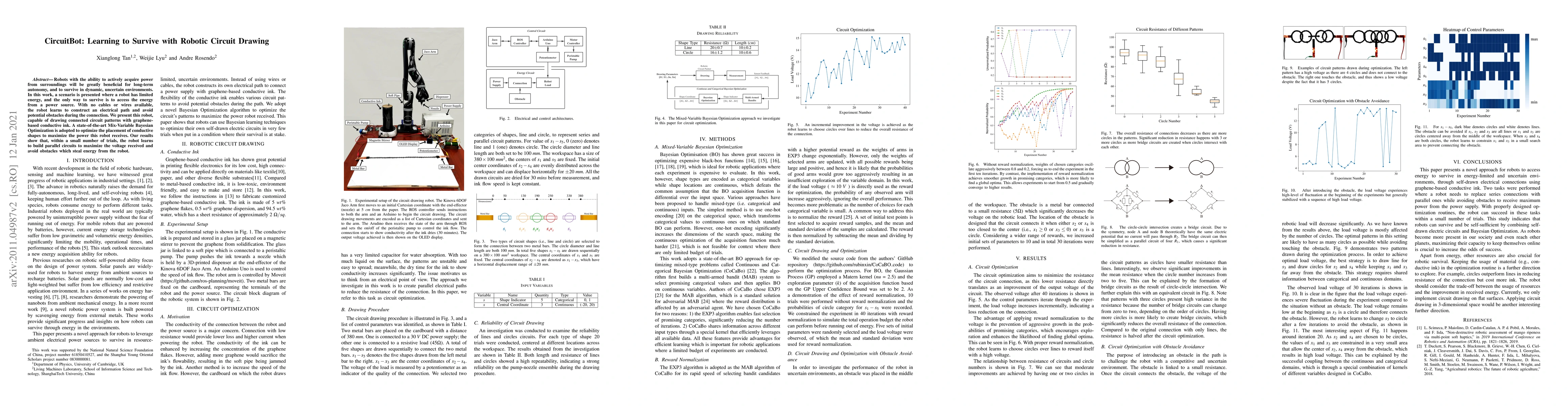 This work stands out by combining self-drawn electric circuits with Bayesian Optimization to enable robots to survive in energy-limited and uncertain environments, a unique approach not extensively explored in previous research.