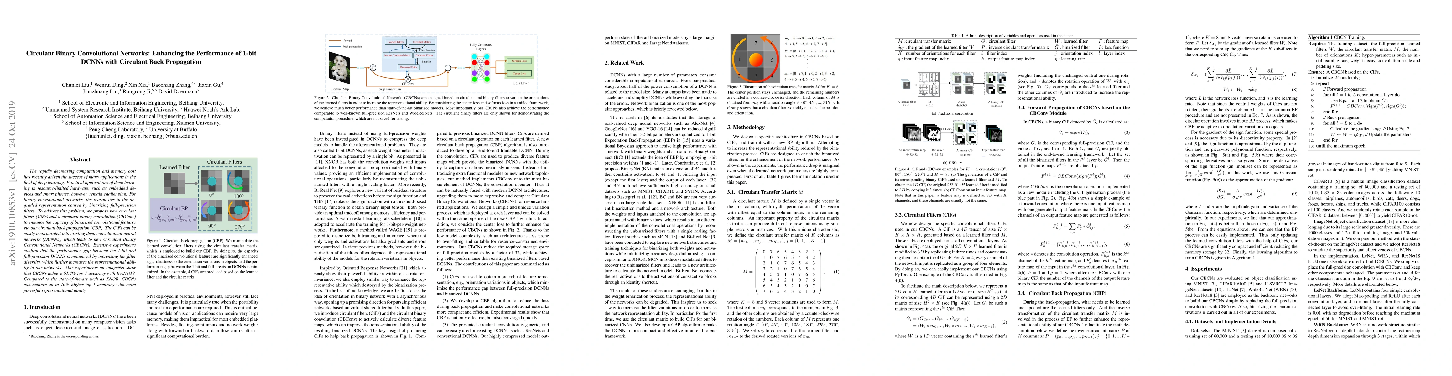 This paper proposes Circulant Binary Convolutional Networks (CBCNs) to enhance the performance of 1-bit DCNNs using circulant filters and circulant back propagation, achieving up to 10% higher top-1 accuracy on ImageNet compared to state-of-the-art methods like XNOR.