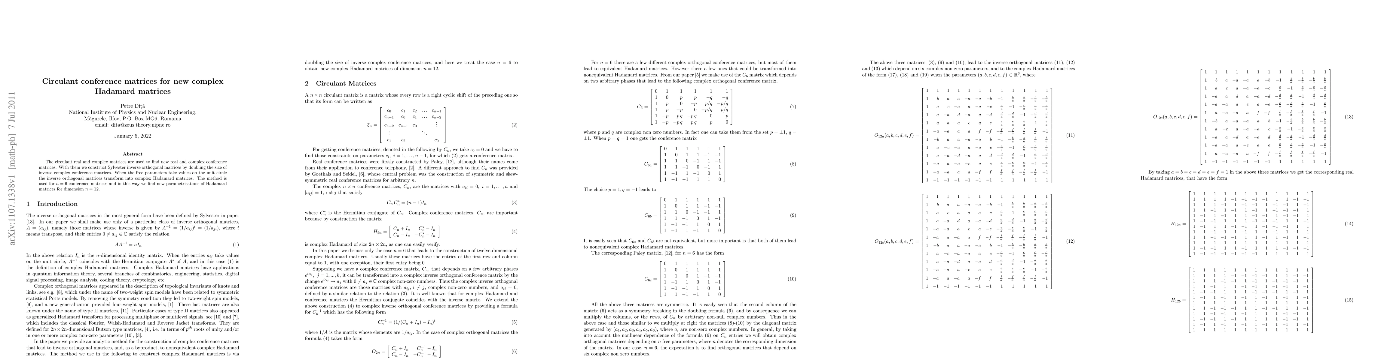 This paper introduces a method using circulant matrices to construct new real and complex conference matrices, leading to Sylvester inverse orthogonal matrices. When parameters are set on the unit circle, these matrices transform into complex Hadamard matrices, resulting in new parametrizations for Hadamard matrices of dimension $n=12$.