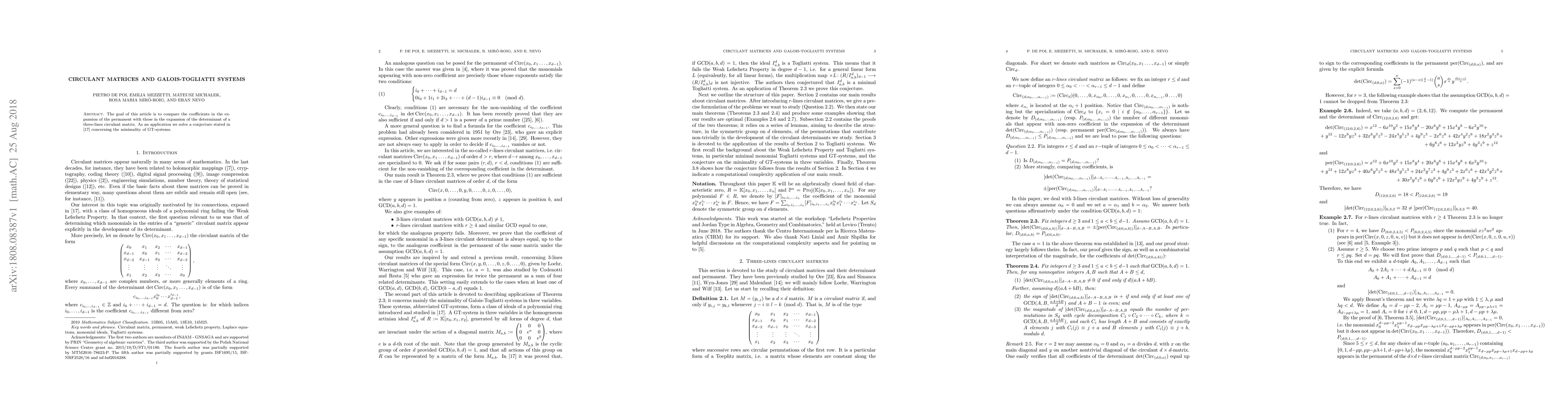 The goal of this article is to compare the coefficients in the expansion of the permanent with those in the expansion of the determinant of a three-lines circulant matrix. As an application we prove a conjecture concerning the minimality of Galois-Togliatti systems.