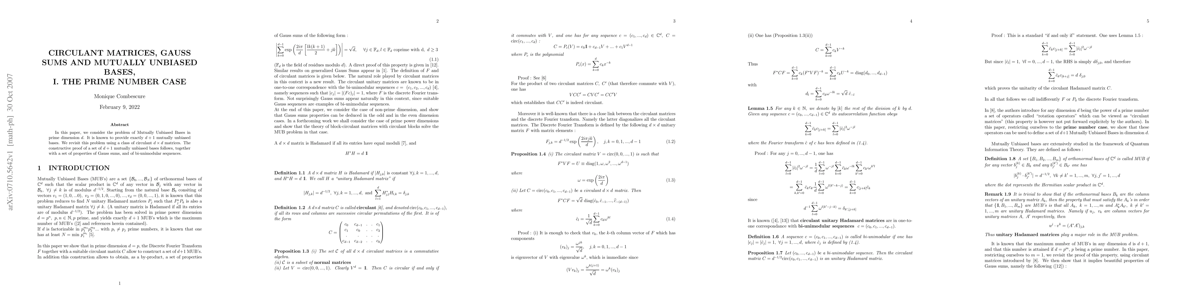 This paper explores the construction of $d+1$ mutually unbiased bases in prime dimension $d$ using circulant matrices. It provides a detailed proof and discusses properties of Gauss sums and bi-unimodular sequences in this context.