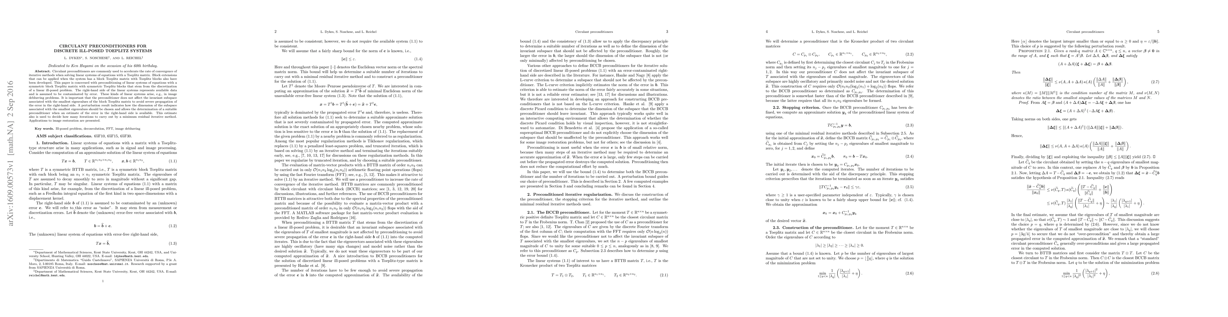 This paper explores circulant preconditioners for solving linear systems arising from discretized ill-posed problems, particularly focusing on symmetric block Toeplitz matrices. It emphasizes the importance of preserving the invariant subspace associated with the smallest eigenvalues to mitigate error propagation, and proposes a method to determine an appropriate preconditioner based on error estimates.