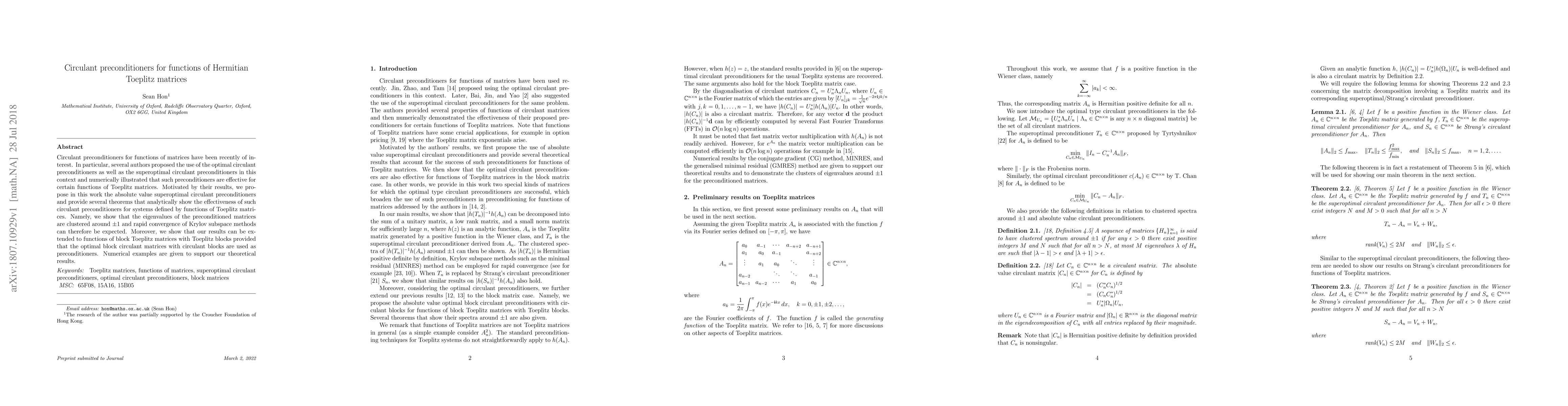 This paper proposes the absolute value superoptimal circulant preconditioners for functions of Hermitian Toeplitz matrices, demonstrating analytically that these preconditioners cluster eigenvalues around $\pm 1$ and enable rapid convergence of Krylov subspace methods. Numerical examples support the theoretical findings.