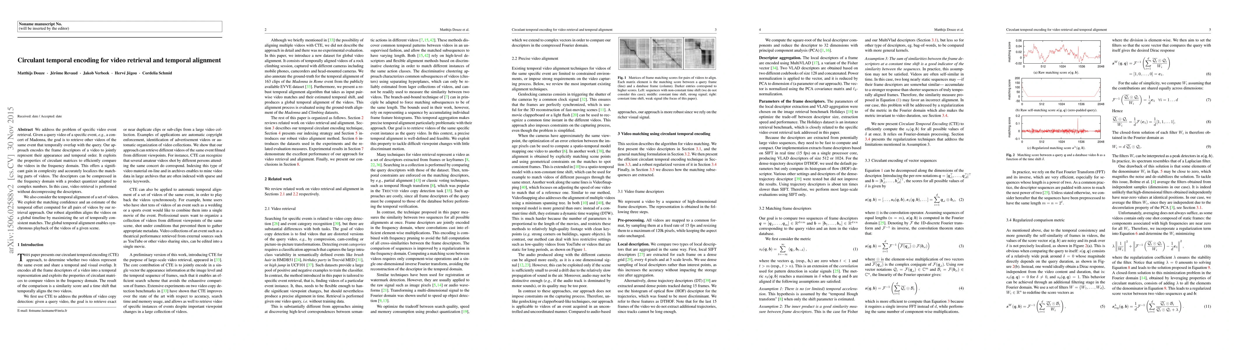 This research paper proposes a new method for video retrieval and temporal alignment that uses circulant matrices to efficiently compare videos in the frequency domain. It enables accurate localisation of matching parts and synchronous playback of videos from the same scene.