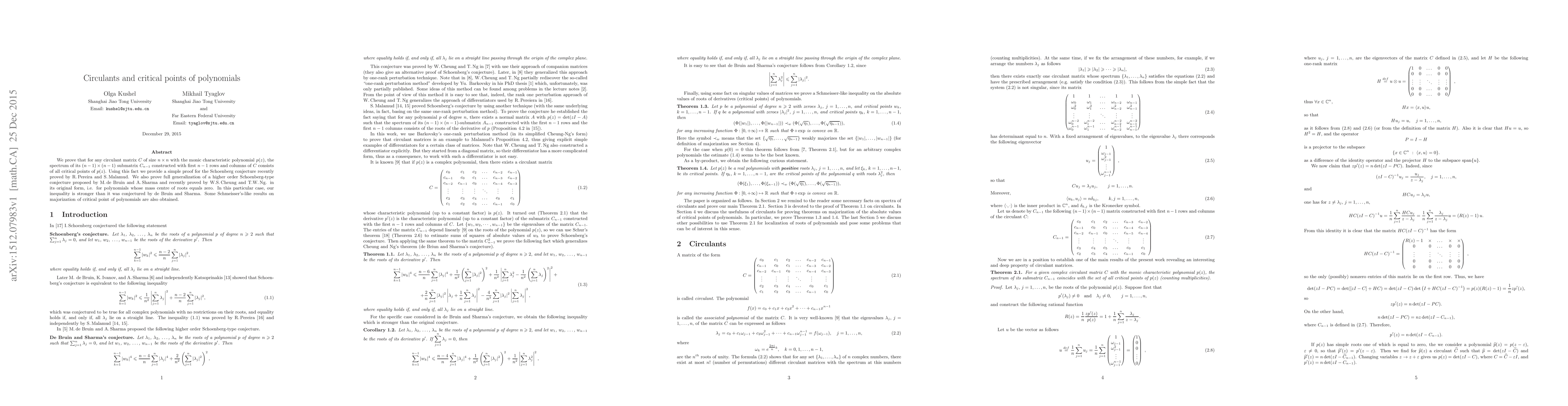 Researchers prove that a specific submatrix of circulant matrices relates to the critical points of their characteristic polynomials, leading to new insights for Schoenberg-type conjectures and polynomial inequalities.