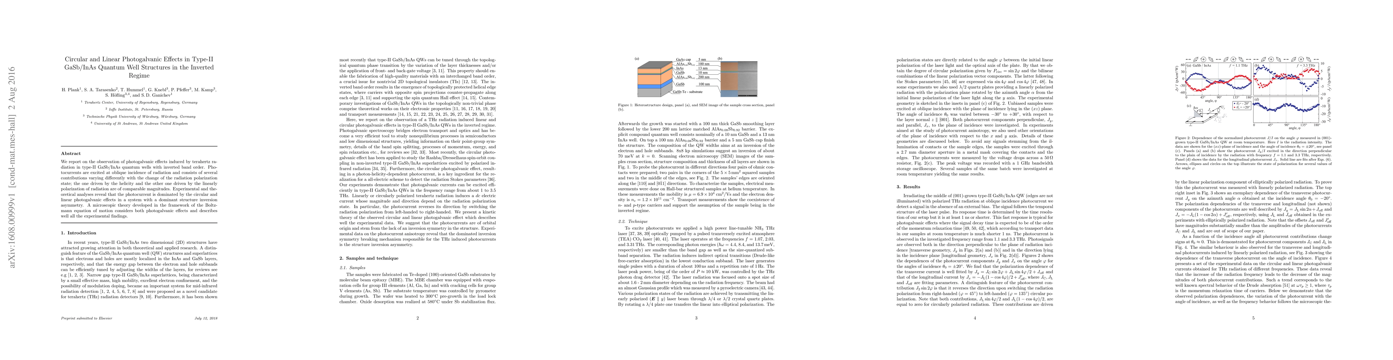 This paper reports on the observation of circular and linear photogalvanic effects in inverted GaSb/InAs quantum wells under terahertz radiation, revealing significant contributions from both effects. A developed microscopic theory aligns well with experimental findings, highlighting the role of structure inversion asymmetry.