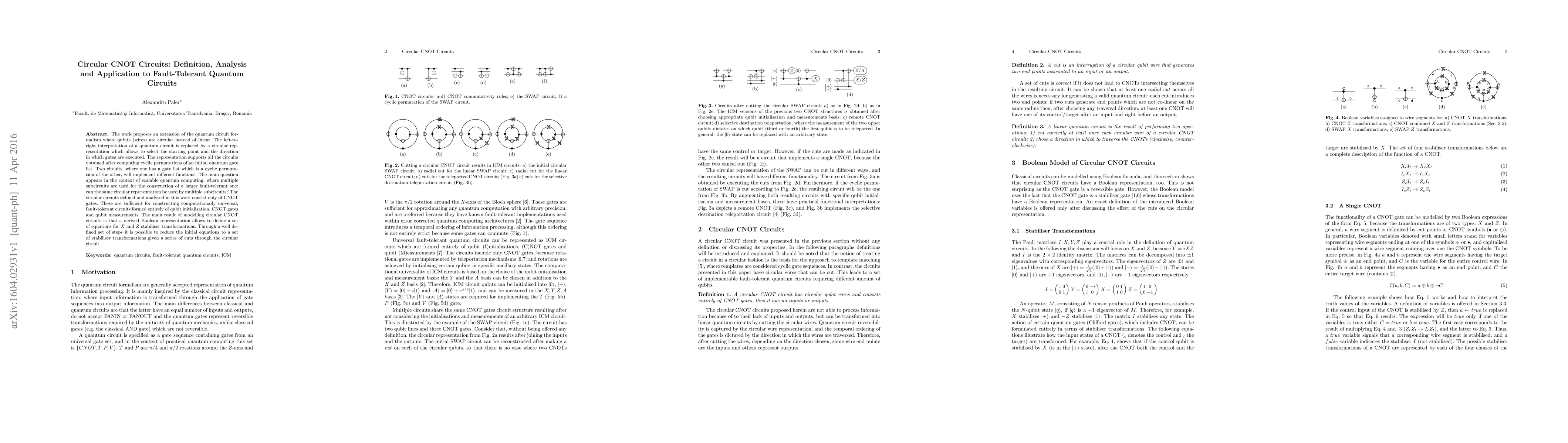 This paper introduces circular CNOT circuits, a novel quantum circuit formalism where qubits are arranged in a circular manner, enabling flexible gate execution directions. The study demonstrates that these circuits can construct scalable, fault-tolerant quantum circuits, providing a Boolean representation that simplifies the derivation of $X$ and $Z$ stabiliser transformations.
