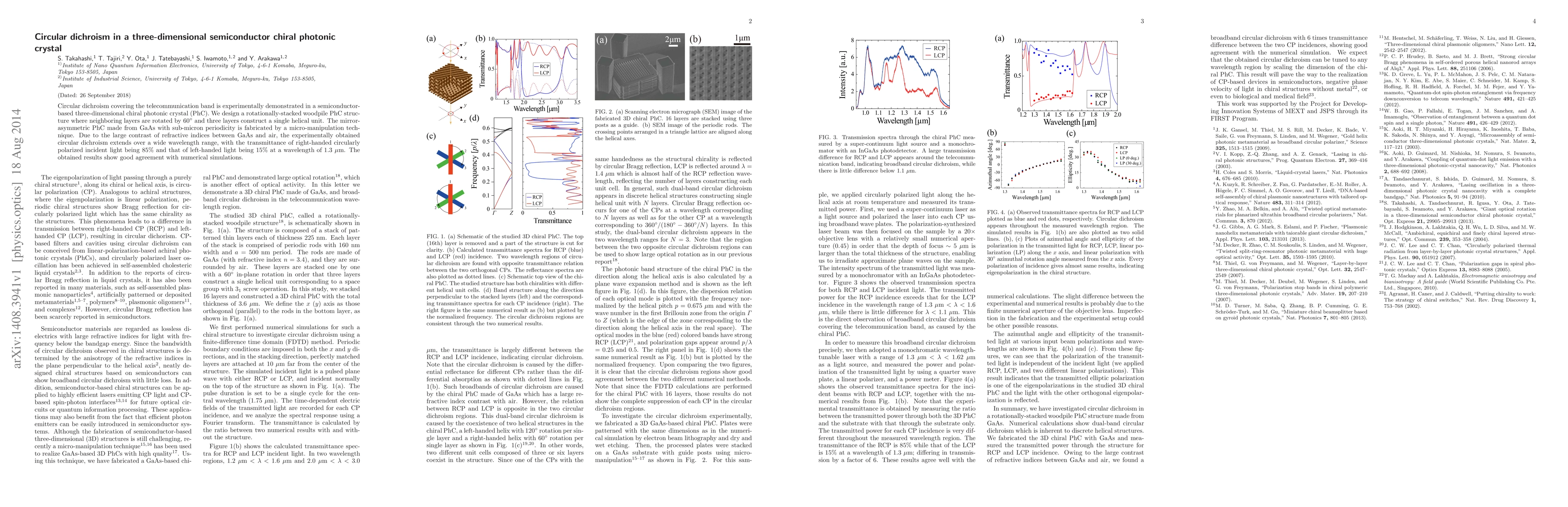 This paper demonstrates circular dichroism in a three-dimensional chiral photonic crystal made from GaAs, achieving high transmittance for right-handed circularly polarized light and low for left-handed at 1300 nm, with results validated by simulations.