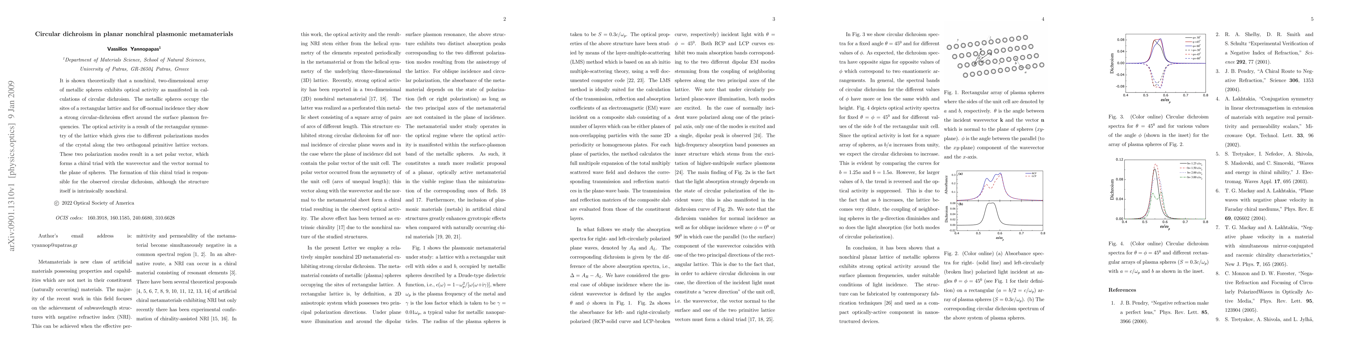 The paper demonstrates theoretically that a planar, nonchiral lattice of metallic spheres shows optical activity and circular dichroism under off-normal incidence due to the rectangular symmetry of the lattice, which creates different polarization modes, leading to an intrinsic chiral triad responsible for the observed effect. Despite the nonchiral nature of the structure, it exhibits optical activity due to this symmetry-induced chirality.