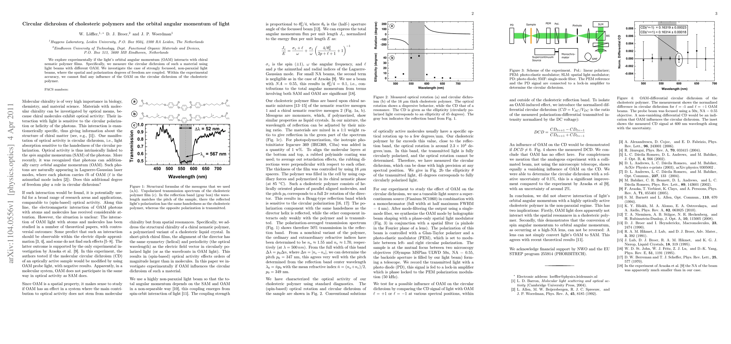 Summary: This study investigates the interaction between the orbital angular momentum of light and chiral nematic polymer films, measuring circular dichroism with light beams of varying OAM. Results show no detectable influence of OAM on the circular dichroism of cholesteric polymers under strongly focused, non-paraxial conditions.