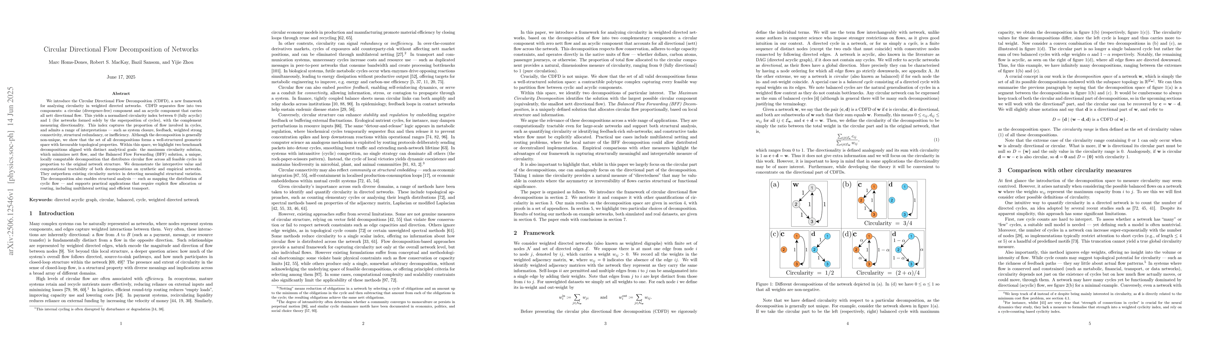 We introduce the Circular Directional Flow Decomposition (CDFD), a new framework for analyzing circularity in weighted directed networks. CDFD separates flow into two components: a circular (divergence-free) component and an acyclic component that carries all nett directional flow. This yields a normalized circularity index between 0 (fully acyclic) and 1 (for networks formed solely by the superposition of cycles), with the complement measuring directionality. This index captures the proportion of flow involved in cycles, and admits a range of interpretations - such as system closure, feedback, weighted strong connectivity, structural redundancy, or inefficiency. Although the decomposition is generally non-unique, we show that the set of all decompositions forms a well-structured geometric space with favourable topological properties. Within this space, we highlight two benchmark decompositions aligned with distinct analytical goals: the maximum circularity solution, which minimizes nett flow, and the Balanced Flow Forwarding (BFF) solution, a unique, locally computable decomposition that distributes circular flow across all feasible cycles in proportion to the original network structure. We demonstrate the interpretive value and computational tractability of both decompositions on synthetic and empirical networks. They outperform existing circularity metrics in detecting meaningful structural variation. The decomposition also enables structural analysis - such as mapping the distribution of cyclic flow - and supports practical applications that require explicit flow allocation or routing, including multilateral netting and efficient transport.