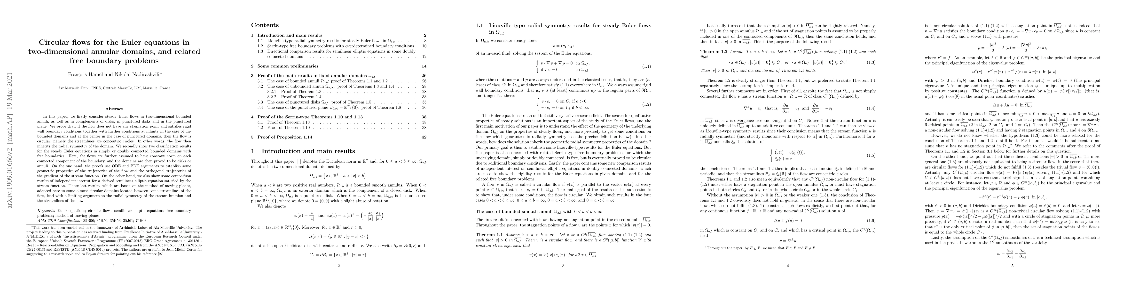 In this paper, we consider steady Euler flows in two-dimensional bounded annuli, as well as in exterior circular domains, in punctured disks and in the punctured plane. We always assume rigid wall boundary conditions. We prove that, if the flow does not have any stagnation point, and if it satisfies further conditions at infinity in the case of an exterior domain or at the center in the case of a punctured disk or the punctured plane, then the flow is circular, namely the streamlines are concentric circles. In other words, the flow then inherits the radial symmetry of the domain. The proofs are based on the study of the trajectories of the flow and the orthogonal trajectories of the gradient of the stream function, which is shown to satisfy a semilinear elliptic equation in the whole domain. In exterior or punctured domains, the method of moving planes is applied to some almost circular domains located between some streamlines of the flow, and the radial symmetry of the stream function is shown by a limiting argument. The paper also contains two Serrin-type results in simply or doubly connected bounded domains with free boundaries. Here, the flows are further assumed to have constant norm on each connected component of the boundary and the domains are then proved to be disks or annuli.