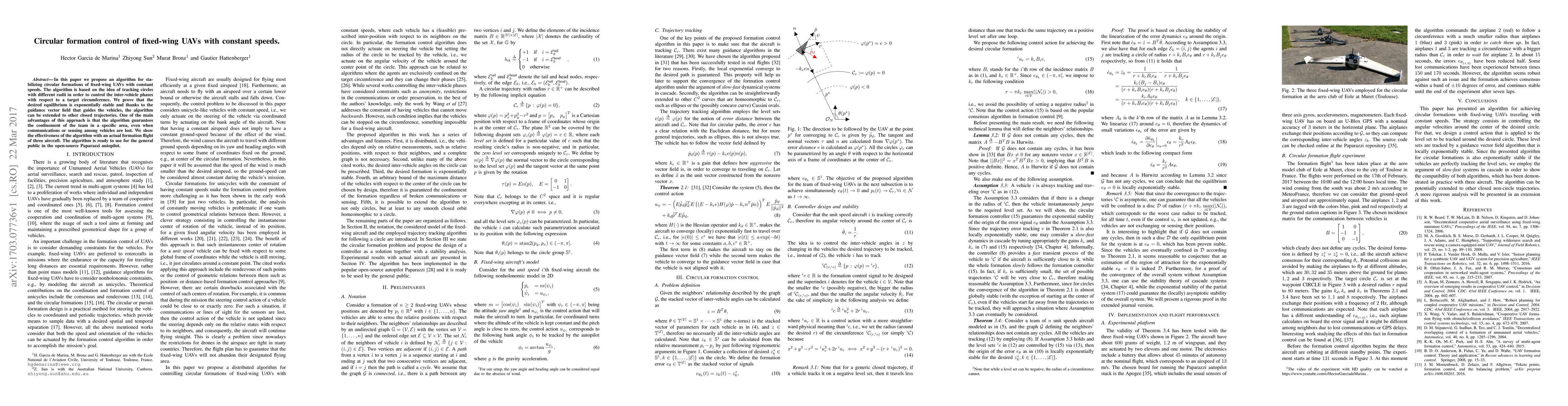 This paper proposes an algorithm for stabilizing circular formations of fixed-wing UAVs at constant speeds, ensuring exponential stability and confinement within a specific area even without inter-vehicle communication. The algorithm is demonstrated effective through a formation flight of three aircraft and is available for public use in the Paparazzi autopilot.