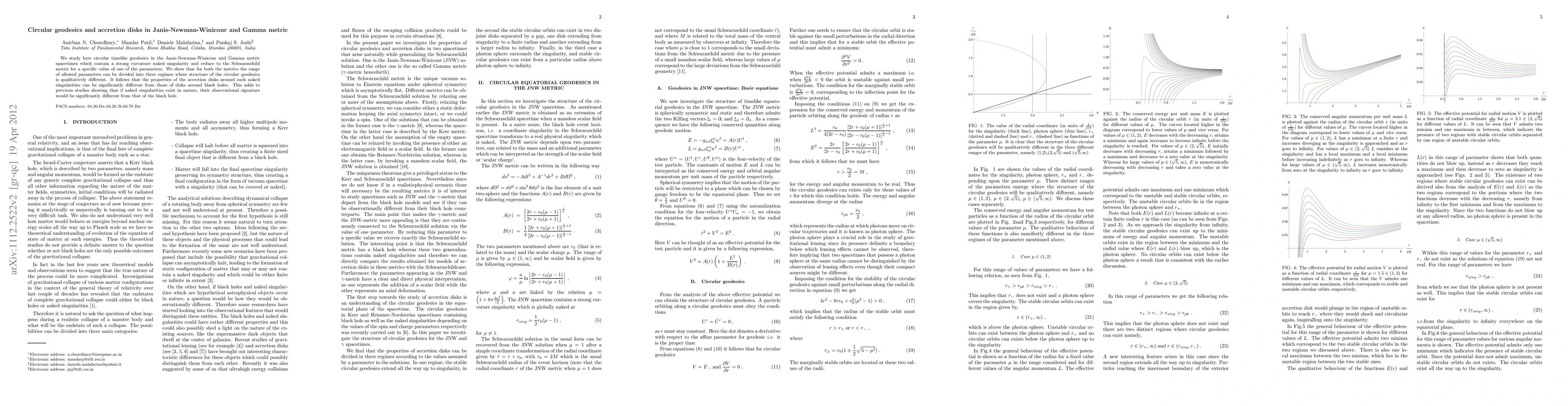 This paper investigates circular timelike geodesics in the Janis-Newman-Winicour and Gamma metric spacetimes, revealing three distinct regimes for the structure of these geodesics. The study concludes that accretion disks around these naked singularities would exhibit properties markedly different from those around black holes, suggesting unique observational signatures if naked singularities exist.
