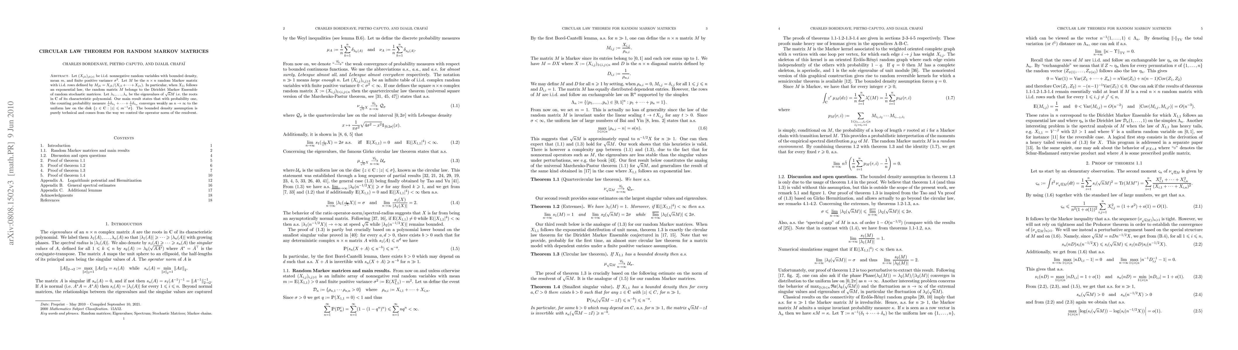 Consider an nxn random matrix X with i.i.d. nonnegative entries with bounded density, mean m, and finite positive variance sigma^2. Let M be the nxn random Markov matrix with i.i.d. rows obtained from X by dividing each row of X by its sum. In particular, when X11 follows an exponential law, then M belongs to the Dirichlet Markov Ensemble of random stochastic matrices. Our main result states that with probability one, the counting probability measure of the complex spectrum of n^(1/2)M converges weakly as n tends to infinity to the uniform law on the centered disk of radius sigma/m. The bounded density assumption is purely technical and comes from the way we control the operator norm of the resolvent.