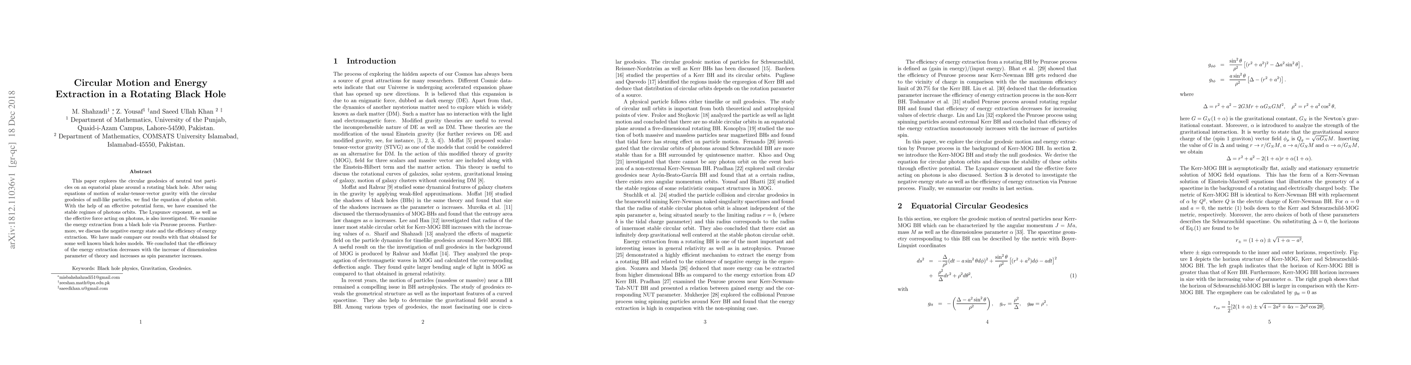 This paper investigates energy extraction from rotating black holes using circular geodesics, finding that efficiency decreases with theory's dimensionless parameter and increases with spin parameter.